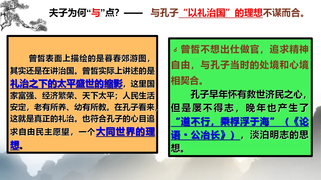 难点:理解孔子为何“喟然叹曰:‘吾与点也!’”,体会曾皙之志所代表的儒家最高社会理想。
