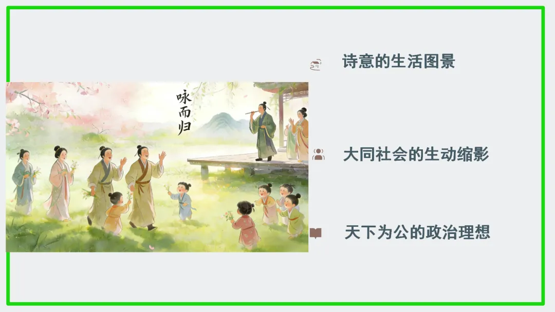 •引导学生理解:曾皙描绘的“浴乎沂,风乎舞雩,咏而归”的场景,并非单纯的个人闲适,而是儒家“大同社会”的缩影,是礼乐教化、天下太平后的理想生活状态,这正是孔子一生追求的目标。