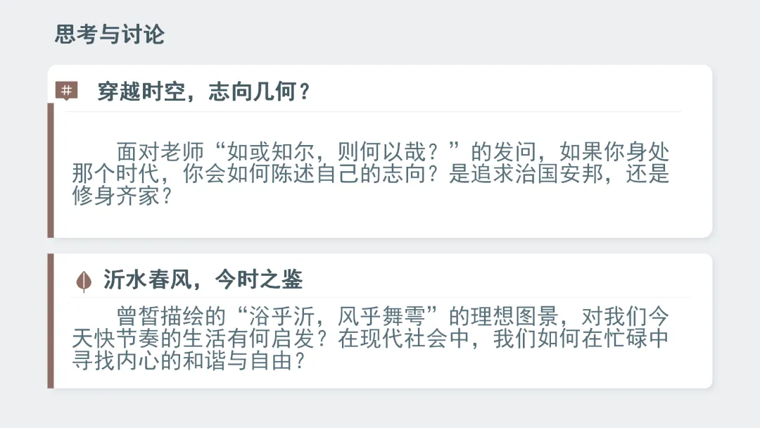 •教师总结:“沂水春风的故事虽已远去,但圣贤们对理想社会的追求和对个人修养的要求,依然值得我们学习。希望同学们都能树立自己的志向,并为之努力。”