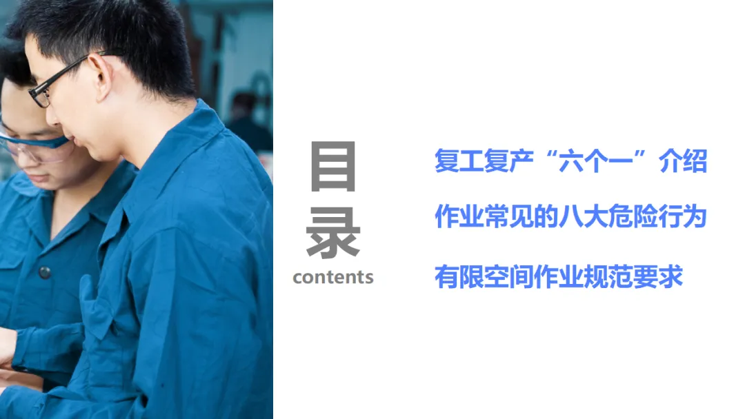 :复工安全教育不能走过场、搞形式,必须因材施教、分类施策。对于不同岗位、不同层级、不同风险等级的员工,教育内容应有所侧重。