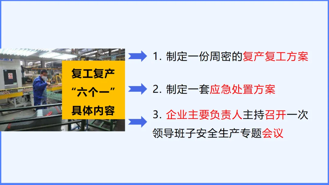 :复产复工方案是企业节后恢复生产的"作战图"和"时间表",是确保复工复产安全有序推进的纲领性文件。该方案必须由企业安全生产技术部门牵头,联合生产、设备、技术、人事等相关部门共同编制,经企业主要负责人审核批准后实施。