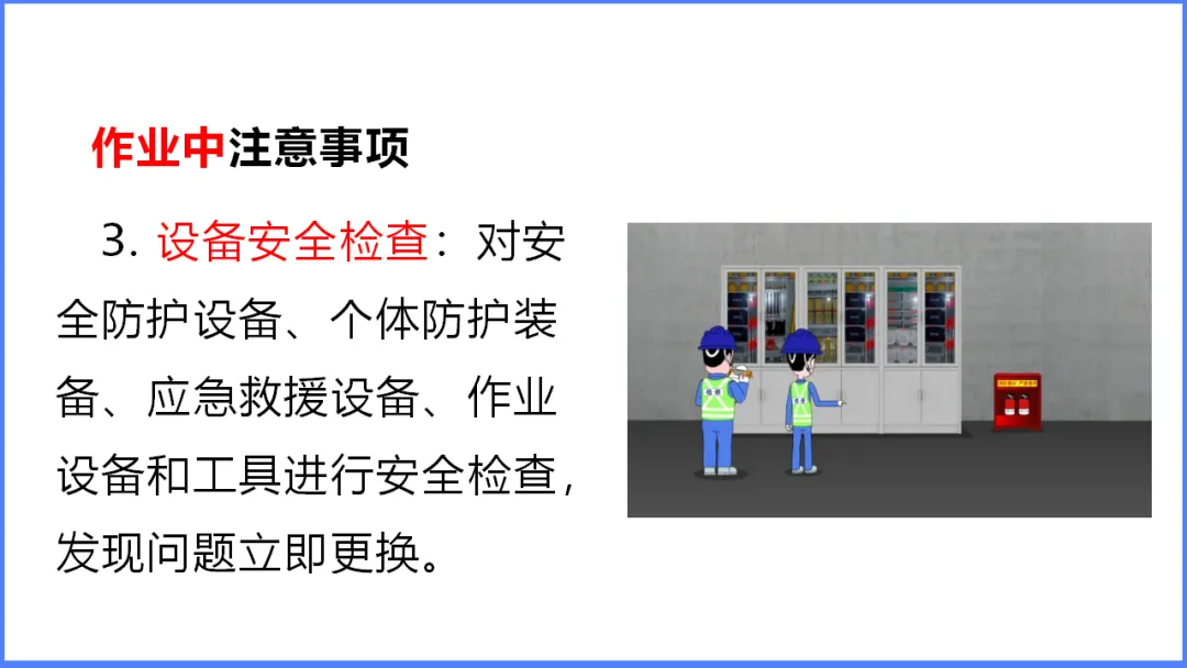 :重点进行岗位安全操作规程、设备安全操作要点、劳动防护用品正确佩戴、事故应急处置、自救互救技能培训。开展"手指口述"安全确认法训练,即心想、眼看、手指、口述,确保操作规范。