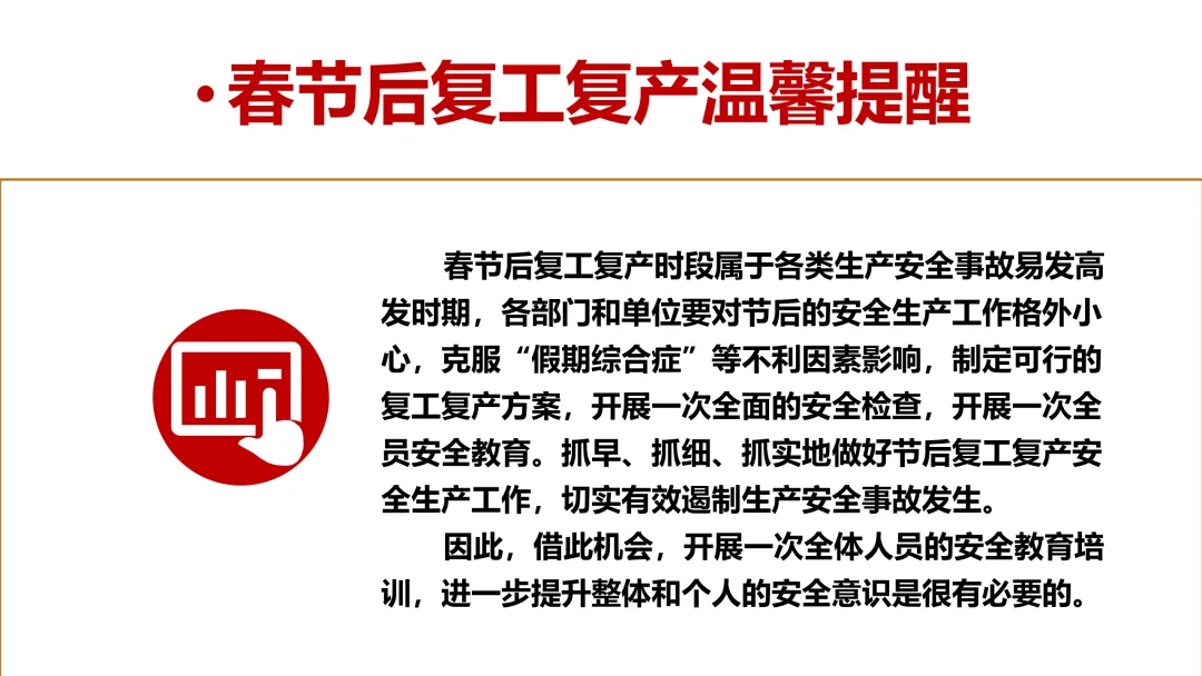 春节假期已过,复工复产同步开启。为切实绷紧安全之弦,杜绝节后麻痹大意,筑牢复工安全防线,今天我们开展复工安全第一课,明确核心要求,全体人员务必牢记于心、严格执行。