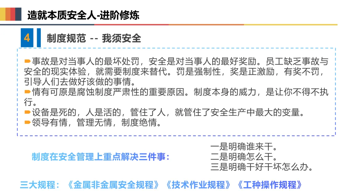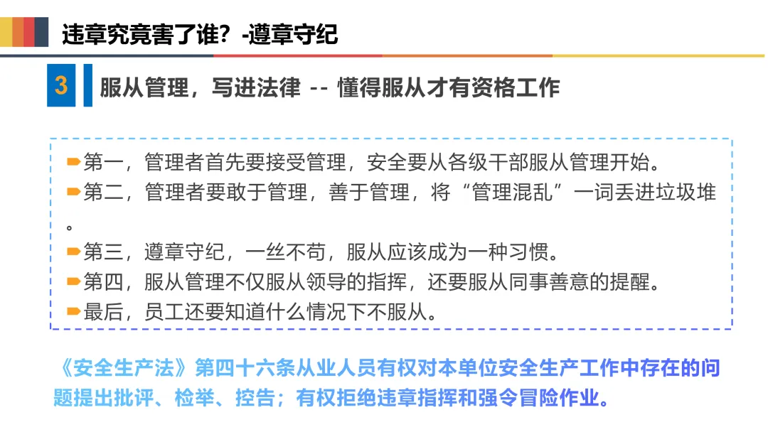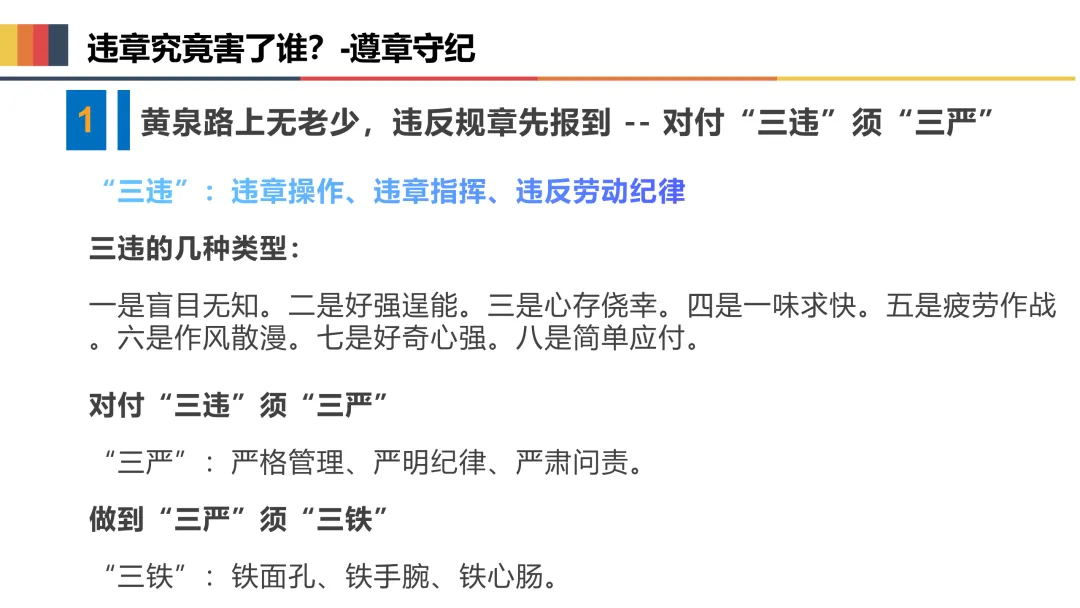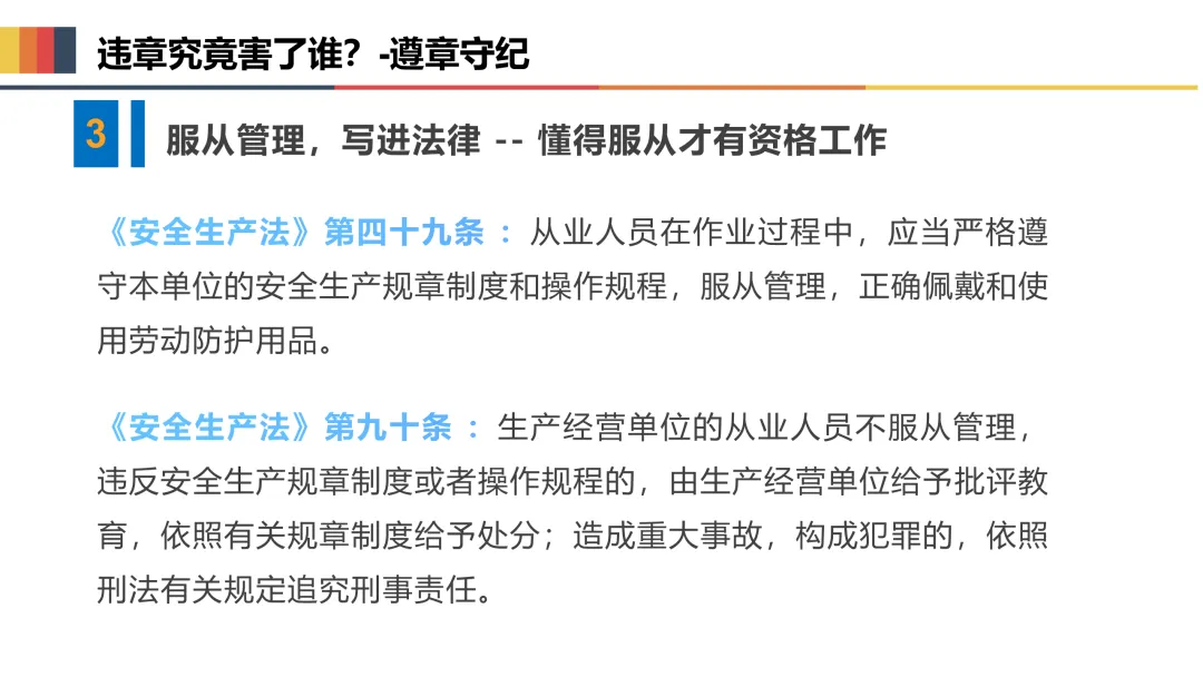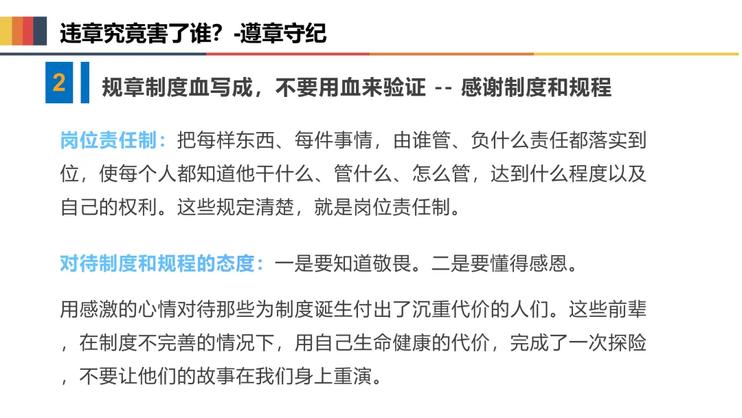 三是规范操作,严守安全规程。严格按照岗位安全操作规程作业,不违章指挥、不违章操作、不违反劳动纪律,正确佩戴和使用劳动防护用品,熟练掌握岗位应急处置方法,遇突发情况及时上报、妥善处置。