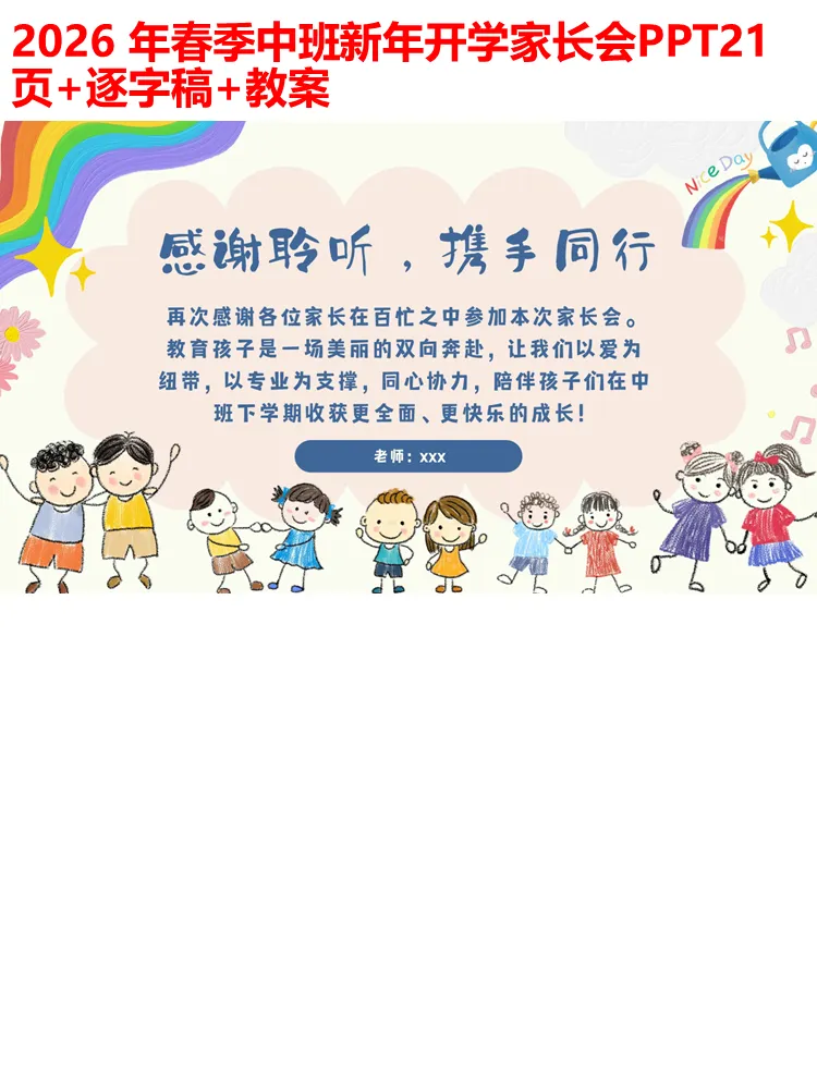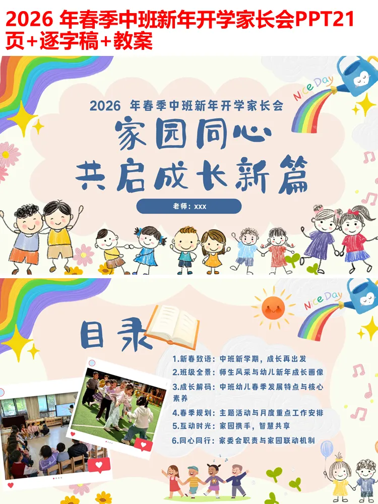 还在为中班开学家长会 PPT 制作焦头烂额?这款2026 春季中班新年开学家长会专属 PPT精准贴合幼儿园中班下学期教学需求,以 “家园同心 共启成长新篇” 为核心,内容完整、逻辑清晰、排版简洁,适配幼师开学家长会使用场景,直接修改即可套用,省时省力出精品,轻松打造专业、高效的家长会现场!