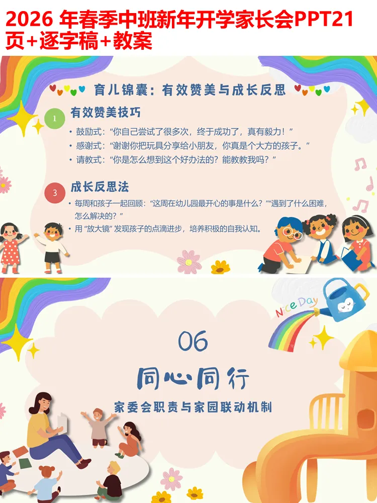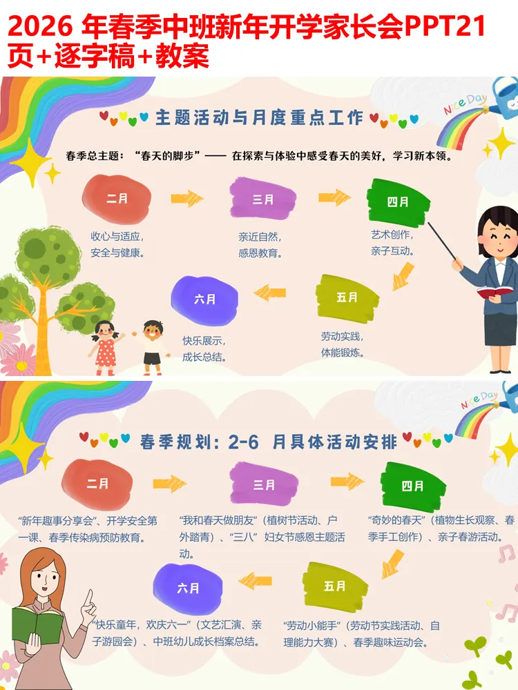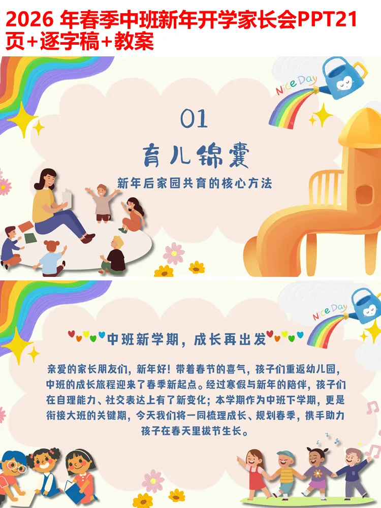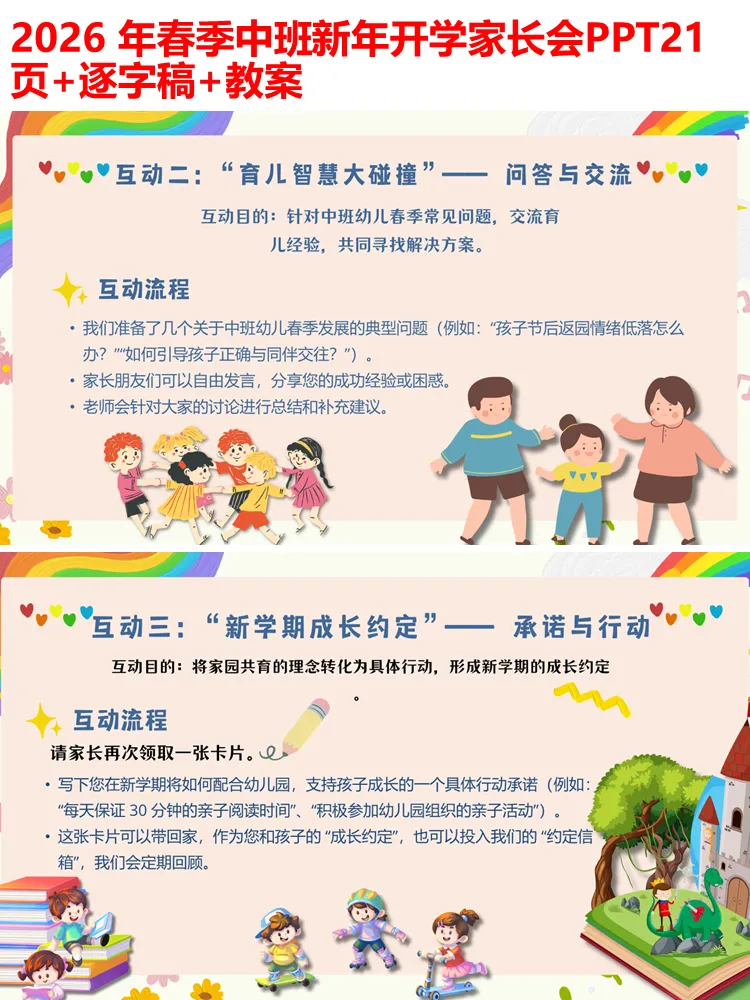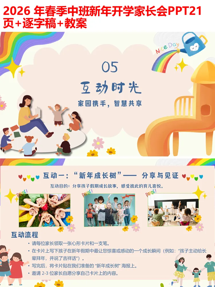 - 互动时光:设计三大趣味互动环节(新年成长树、育儿智慧大碰撞、新学期成长约定),附带详细互动流程,轻松调动家长会现场氛围,促进家园育儿经验交流,让家长会不再是单向讲解,而是双向互动;