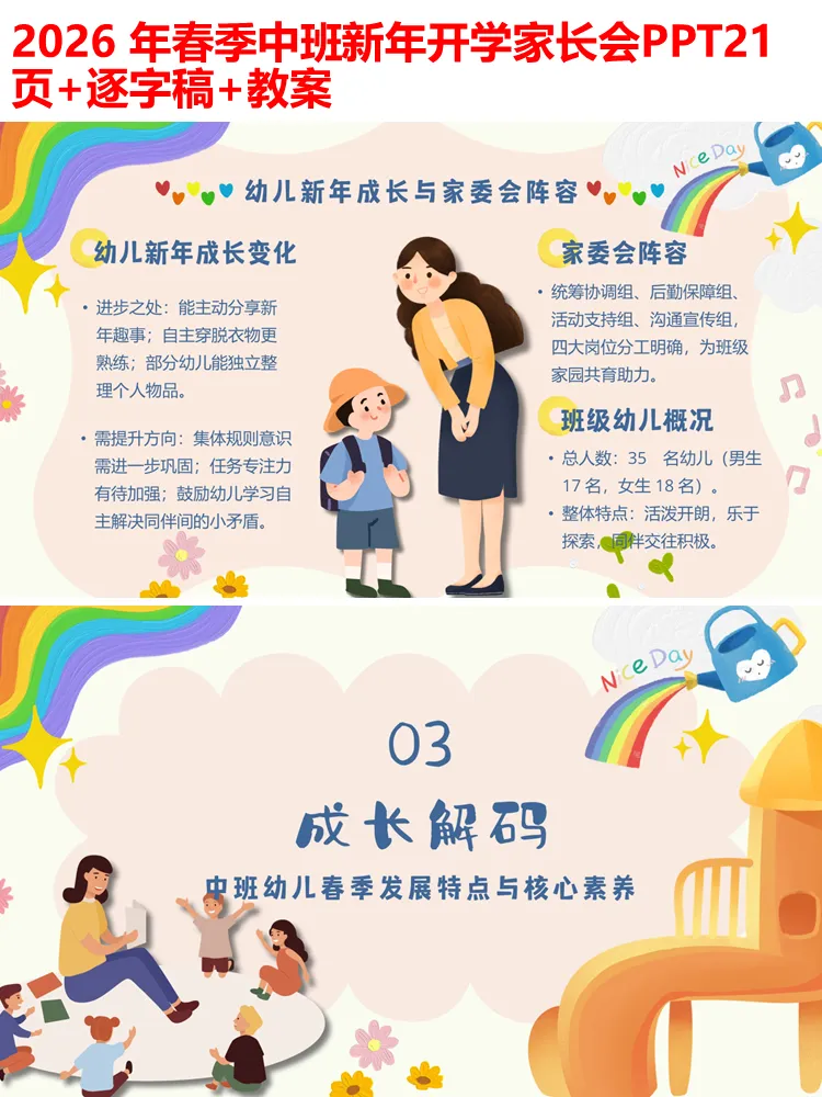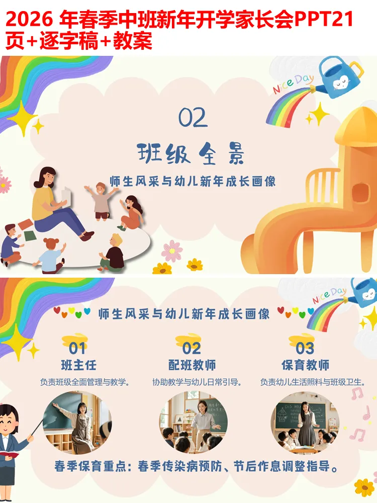 - 班级全景:详细展示师生分工(班主任、配班教师、保育教师)、班级幼儿概况(人数、性格特点)、孩子新年成长画像(进步点 + 待提升方向)及家委会阵容,让家长全面了解班级情况,掌握春季保育重点;