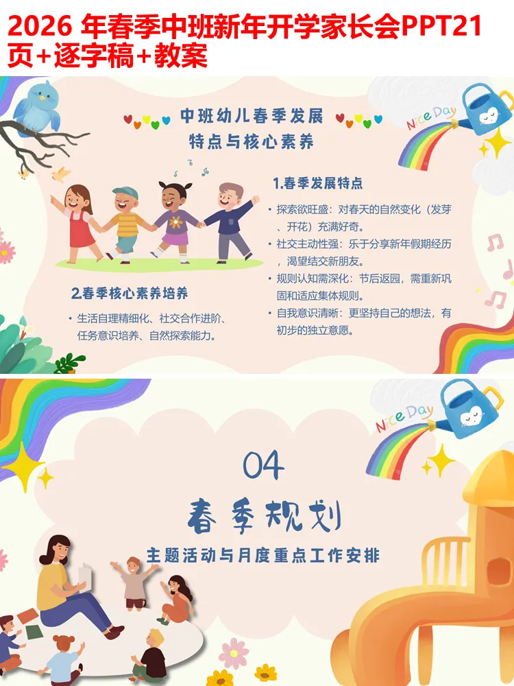 - 成长解码:精准拆解中班幼儿春季发展特点(探索欲旺盛、社交主动性强等),明确春季核心素养培养目标(生活自理、社交合作等),为家长提供专业的育儿发展参考;