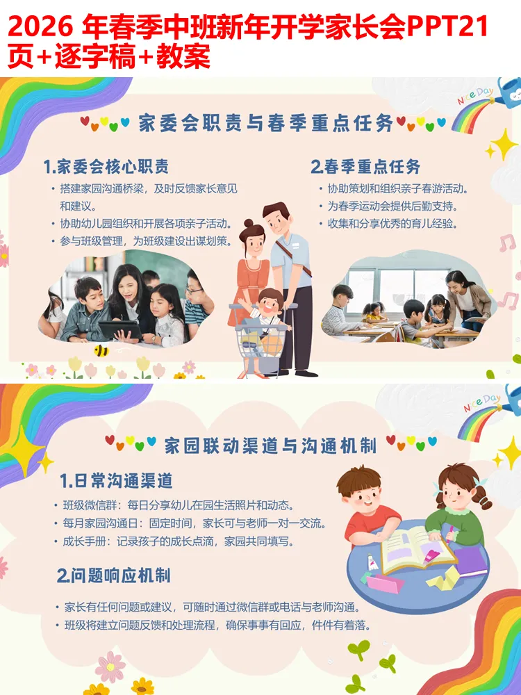 - 同心同行:明确家委会核心职责与春季重点任务,梳理多元家园联动渠道(班级群、家园沟通日、成长手册)与问题响应机制,搭建完善的家园协作桥梁,为新学期家园共育筑牢基础。