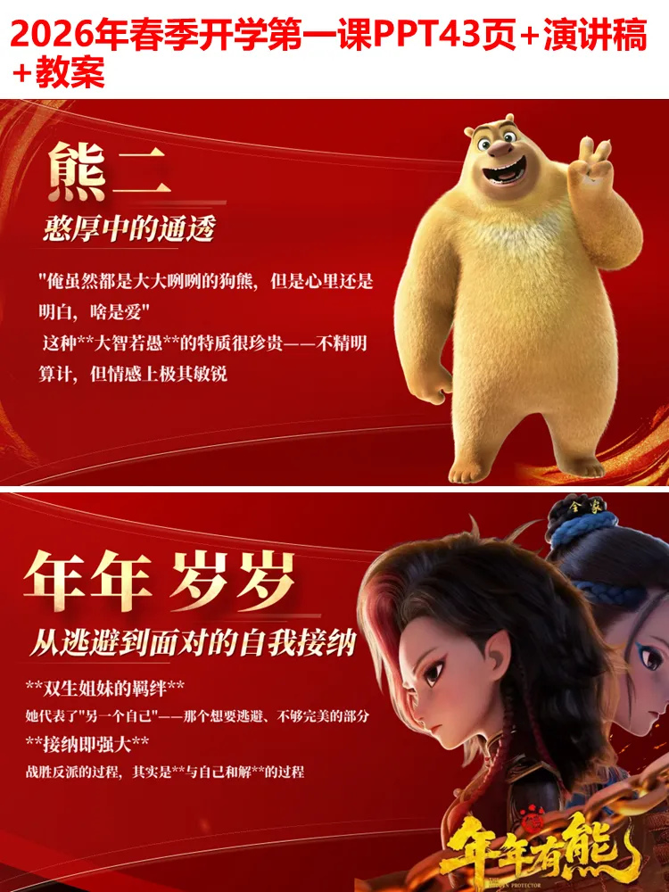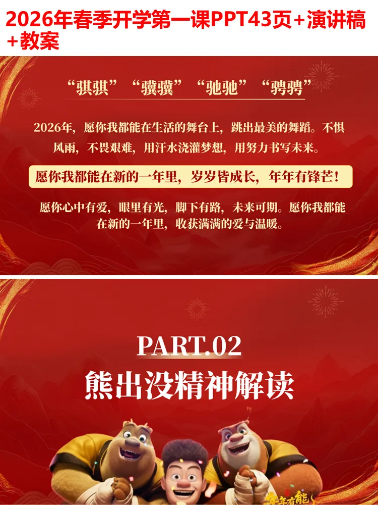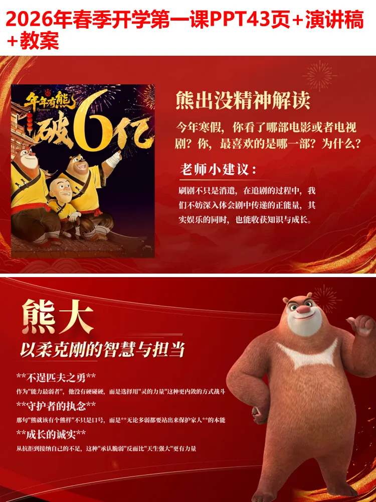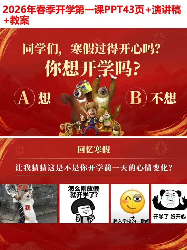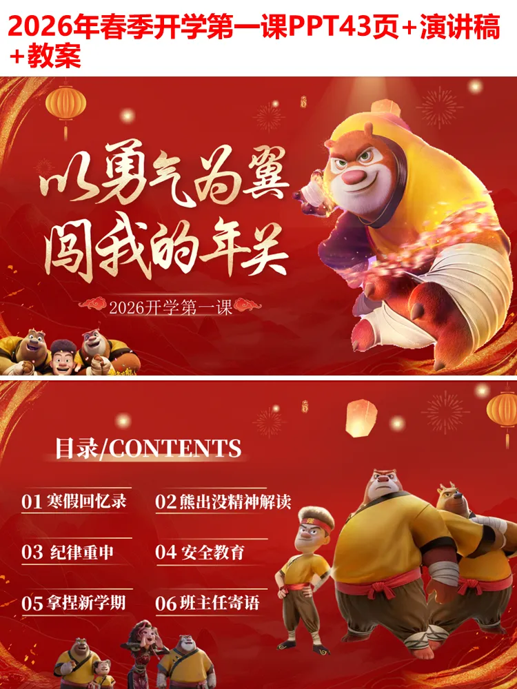 新学期伊始,如何打造一堂有趣、有料、有温度的开学第一课,帮学生快速收心、树立目标、凝聚力量?这份以《熊出没・年年有熊》为主题的 2026 开学第一课 PPT《新学期,重启未来!》绝对是班主任的备课福音,贴合中小学生心理特点,将趣味动画与开学教育深度融合,六大核心板块层层递进,从情绪疏导到精神引领,从纪律规范到安全科普,从学习方法到成长寄语,一站式解决开学第一课备课难题,让课堂生动有趣,让教育入脑入心!