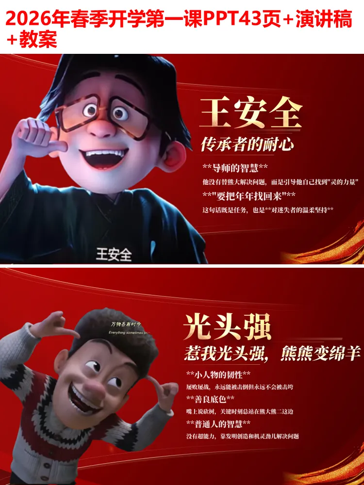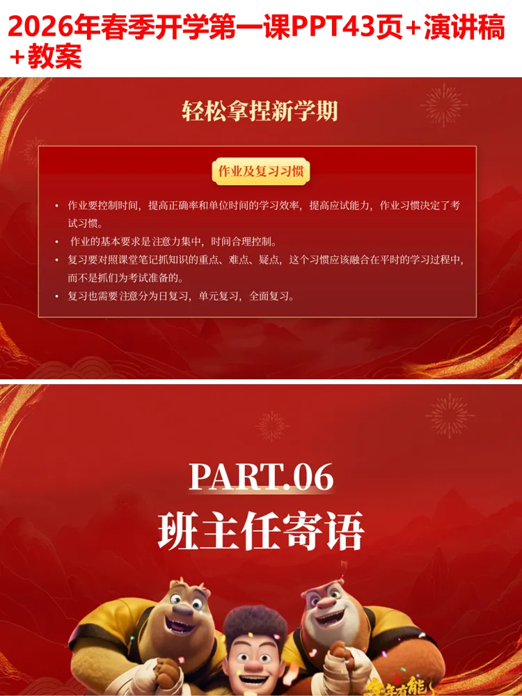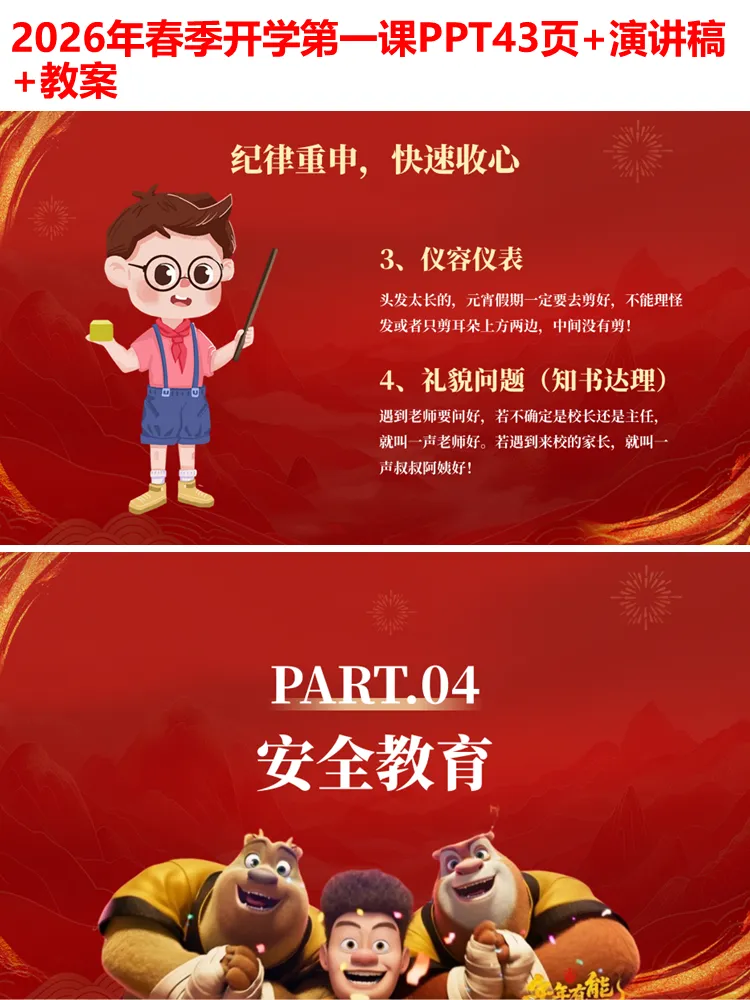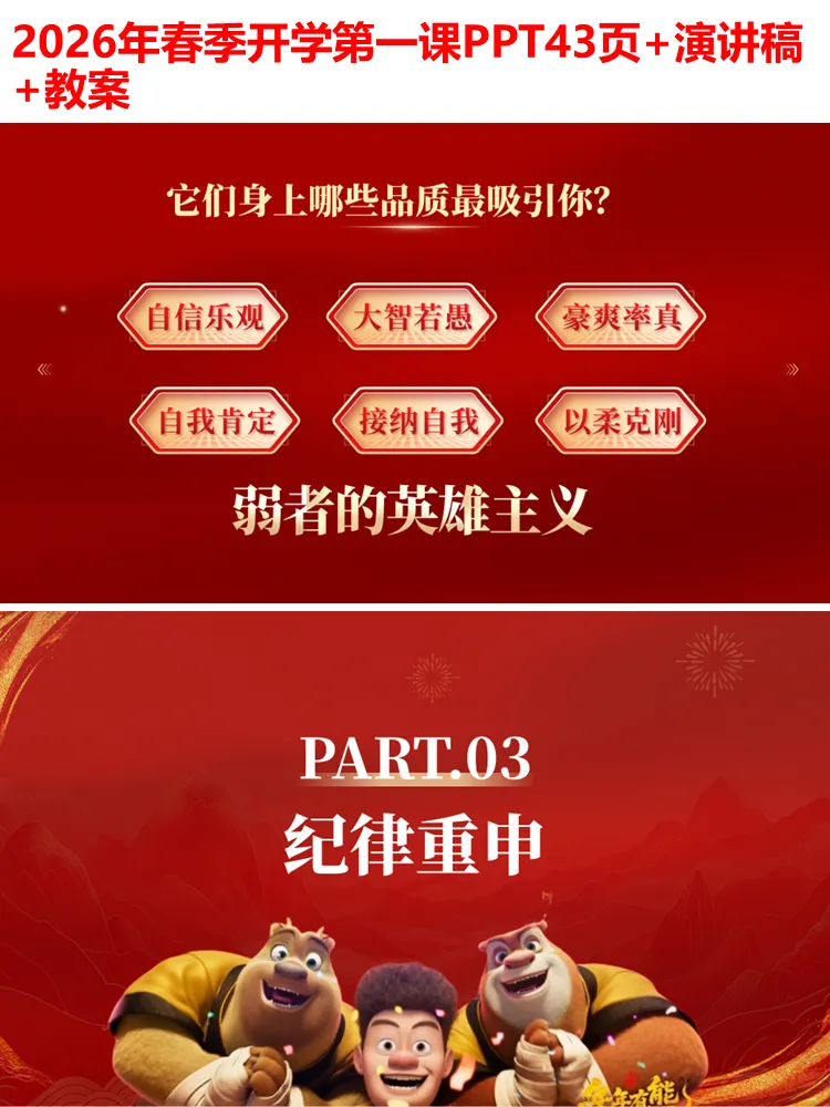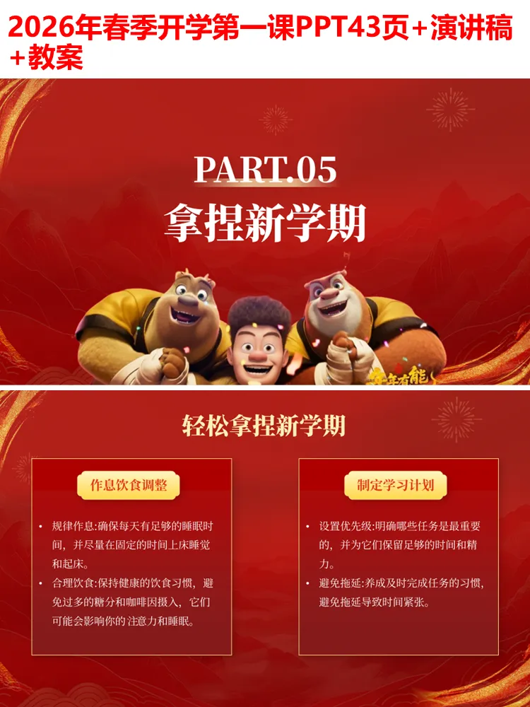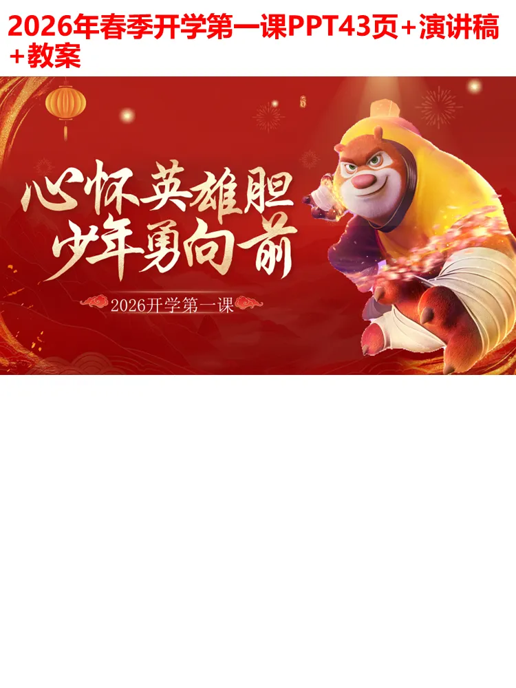 新学期伊始,如何打造一堂有趣、有料、有温度的开学第一课,帮学生快速收心、树立目标、凝聚力量?这份以《熊出没・年年有熊》为主题的 2026 开学第一课 PPT《新学期,重启未来!》绝对是班主任的备课福音,贴合中小学生心理特点,将趣味动画与开学教育深度融合,六大核心板块层层递进,从情绪疏导到精神引领,从纪律规范到安全科普,从学习方法到成长寄语,一站式解决开学第一课备课难题,让课堂生动有趣,让教育入脑入心!