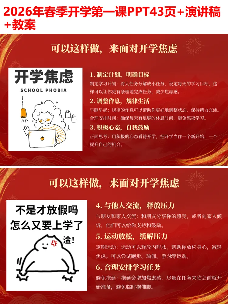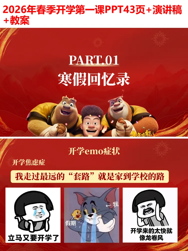 这份 PPT 以学生熟悉的《熊出没・年年有熊》动画为载体,打破传统开学第一课的枯燥说教,先从「寒假回忆录」切入,精准捕捉学生的开学焦虑、emo 情绪,用贴近学生的话语解读开学恐惧的成因,并给出制定计划、调整作息、积极心态、交流解压等 6 个可落地的缓解方法,先疏后导,帮学生接纳情绪、快速切换学习状态,还穿插假期趣闻分享、春晚非遗文化解读等环节,让课堂充满互动与温度。