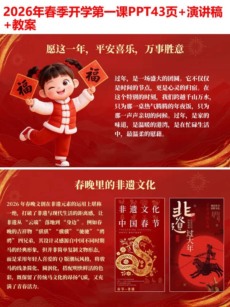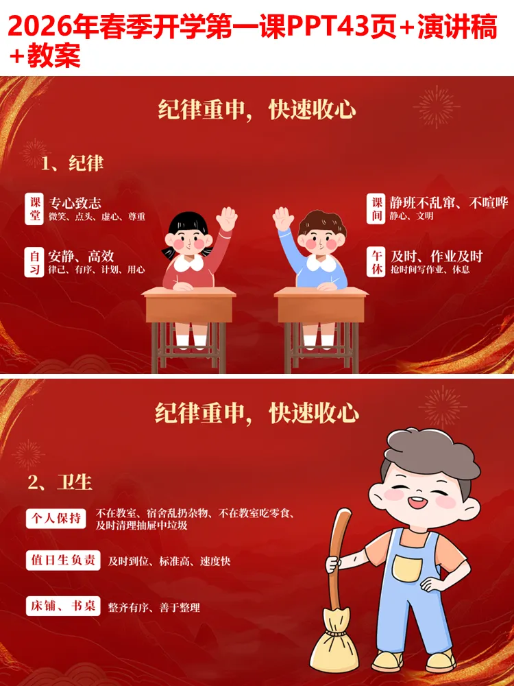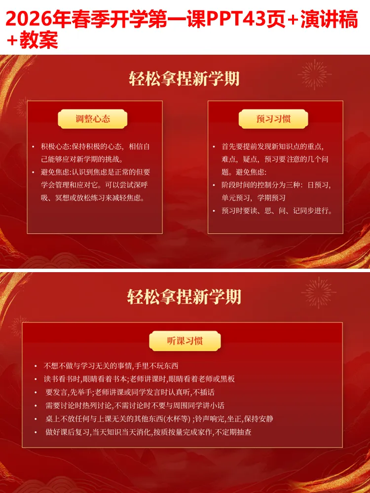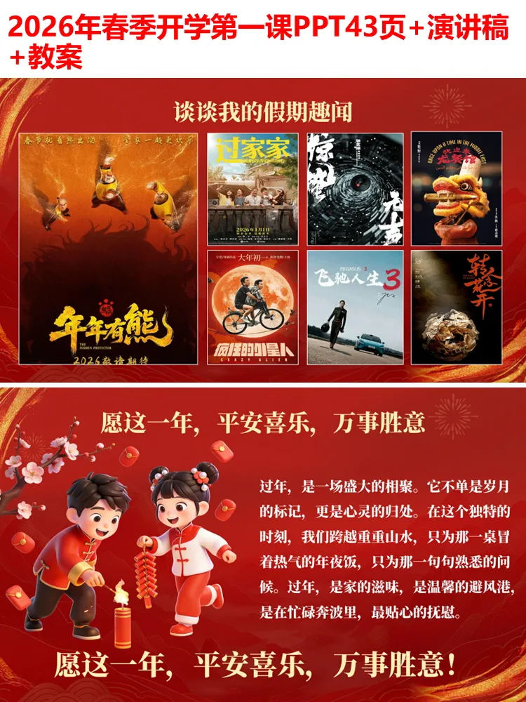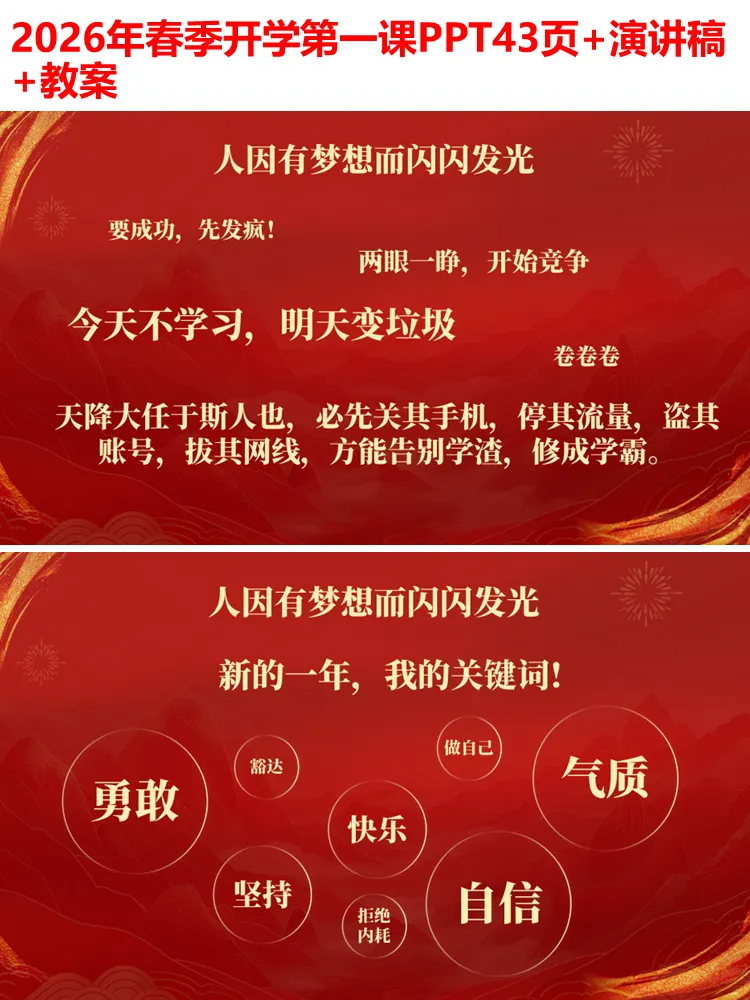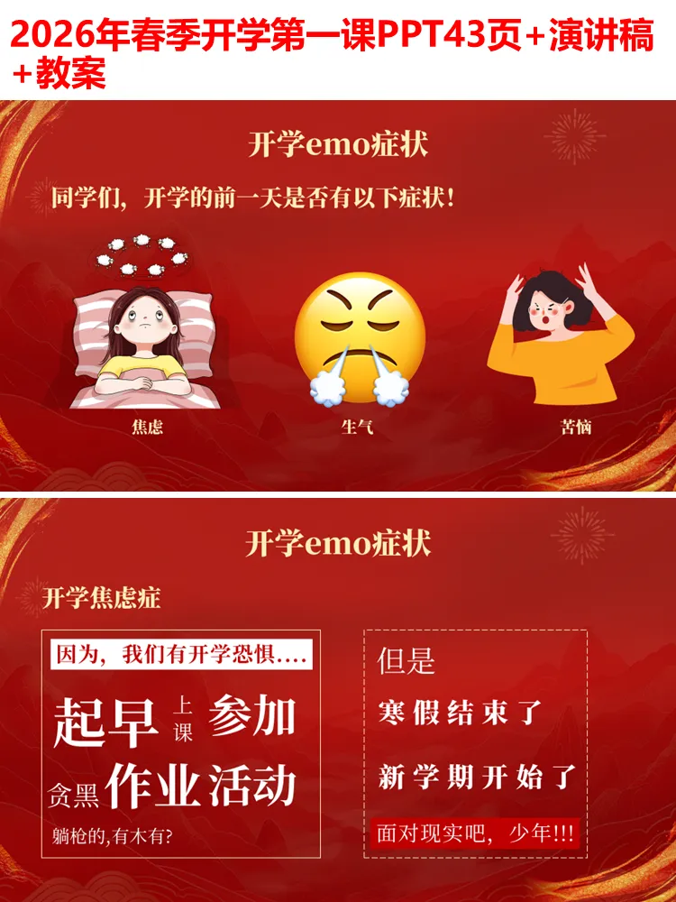 整份 PPT 框架清晰、内容充实,图文结合、逻辑连贯,无需大幅修改即可直接套用,还可根据小学、初中不同学段灵活调整语言难度,既是班主任的备课神器,也是送给学生的新学期成长礼物,用趣味的形式传递教育的温度,让学生在轻松的氛围中收心聚力,带着勇气与力量,开启 2026 新学期的美好旅程!