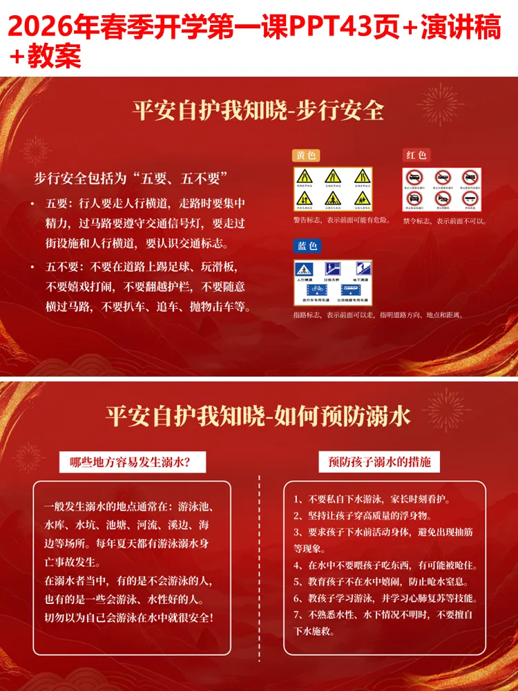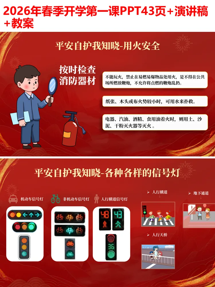 同时,PPT 兼顾开学教育的实用性,「纪律重申」板块明确课堂、课间、自习、午休的行为规范,细化卫生、仪容仪表、校园礼貌等要求,帮班主任快速建立班级规则;「安全教育」板块聚焦用火、交通、防溺水三大校园安全重点,讲解火情扑救、交通信号灯识别、步行五要五不要、防溺水七项措施等实用知识,把平安自护的种子种在学生心中;「拿捏新学期」板块则从作息饮食、学习计划、预习听课、作业复习等方面,教给学生科学的学习方法,培养良好的学习习惯,让学生知道新学期「怎么学、如何做」。