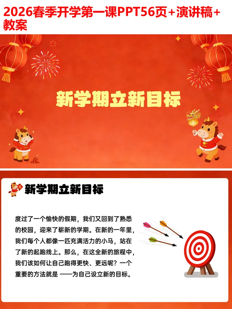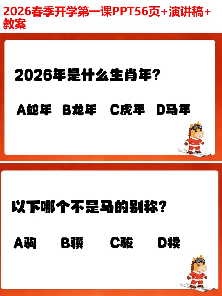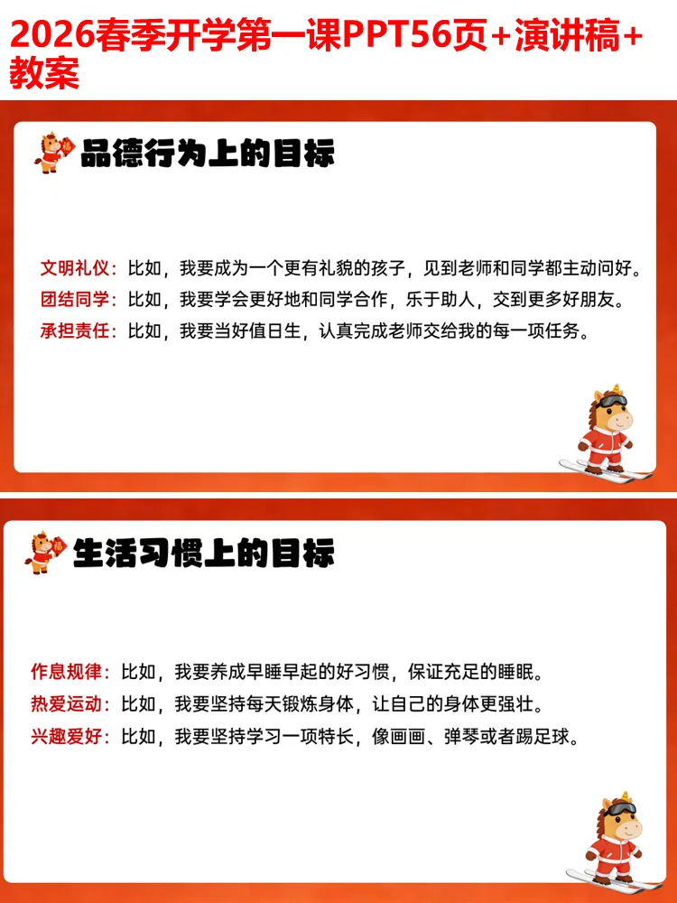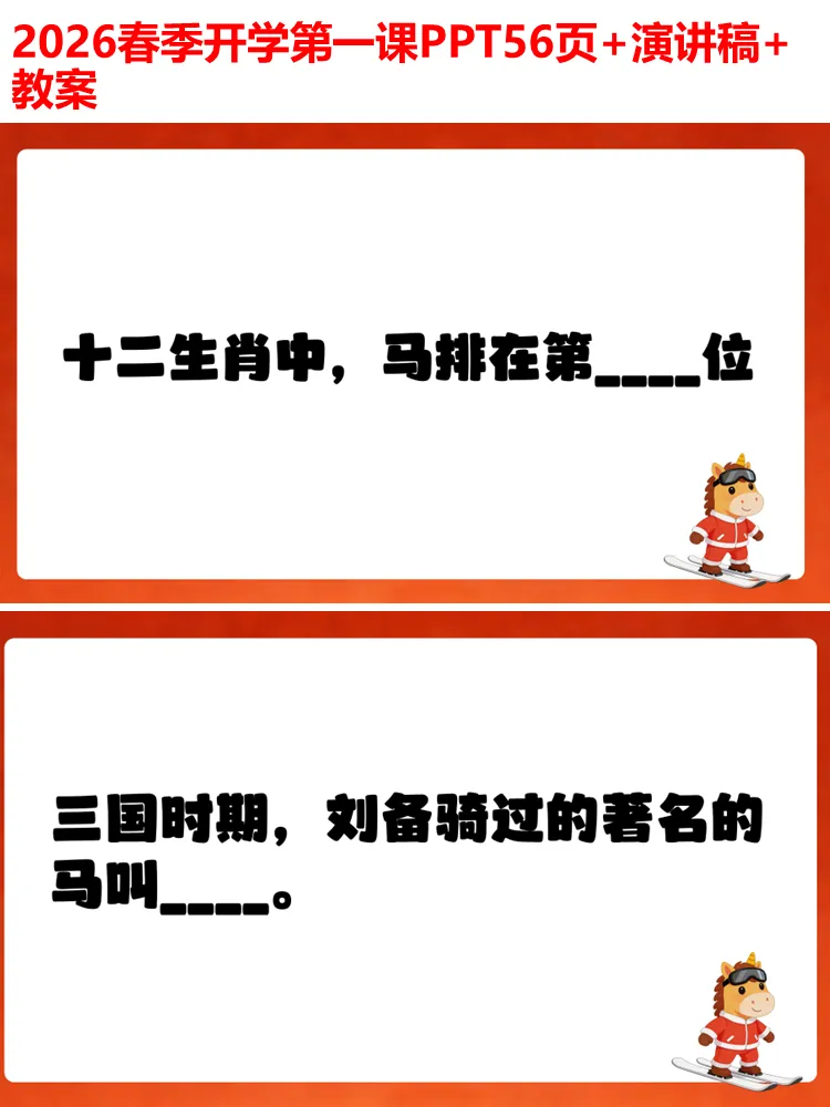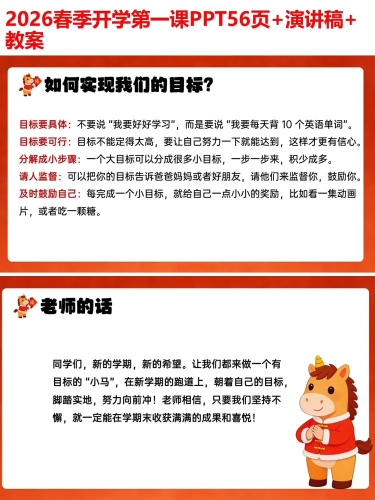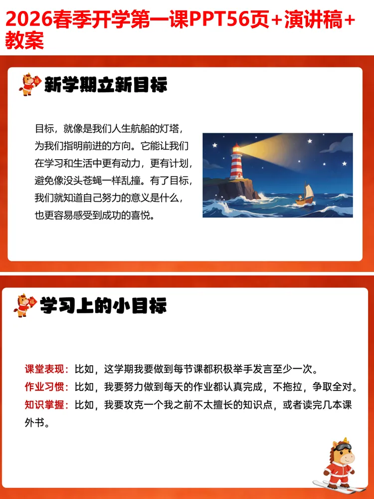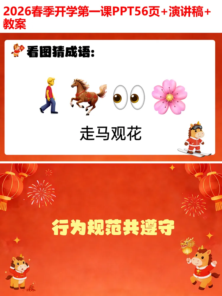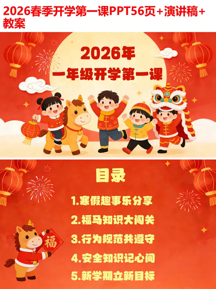 新学期伊始,为让一年级小朋友快速收心归位,融入校园生活,我们打造了以马年为主题的开学第一课 PPT,围绕寒假分享、马年知识、行为规范、安全常识、新学期目标五大板块,用趣味互动、知识科普、习惯培养的形式,为孩子们开启充满新意的校园新旅程,让课堂既有年味又有干货,既有乐趣又有收获。