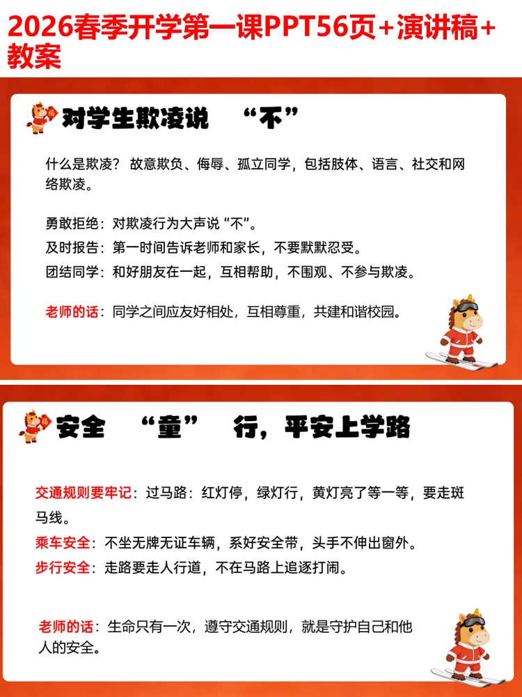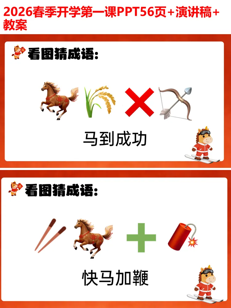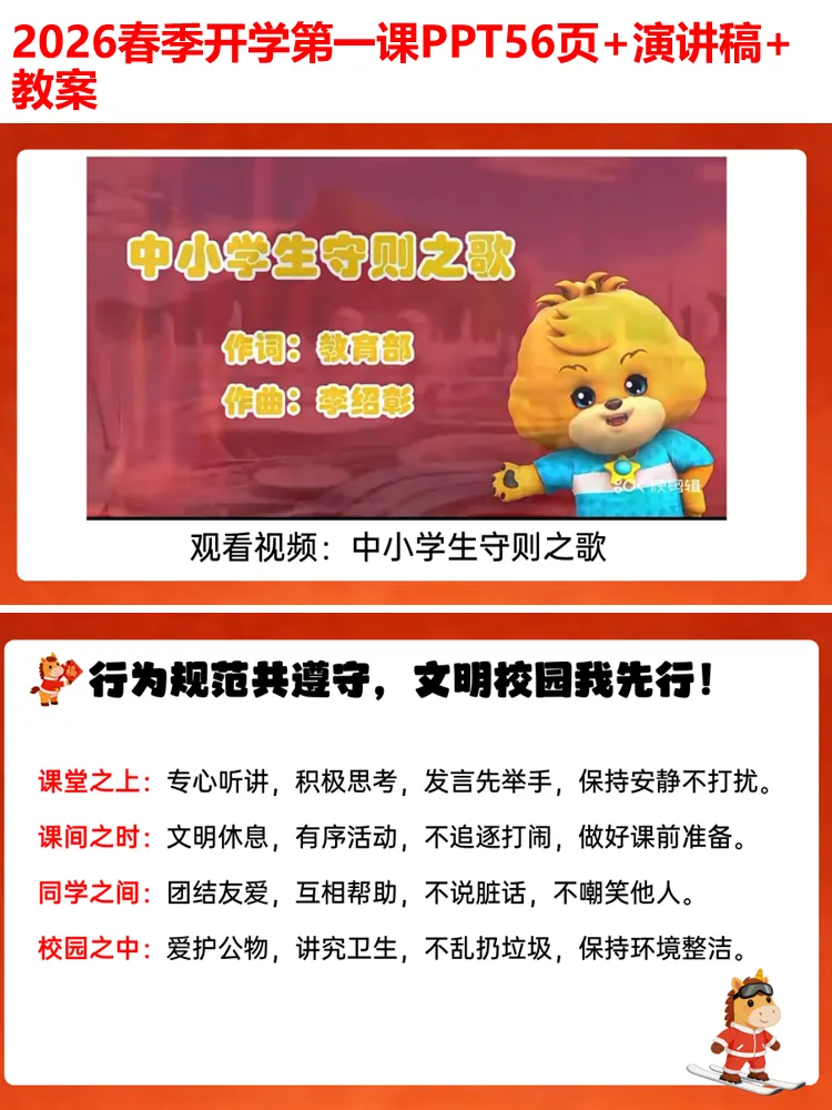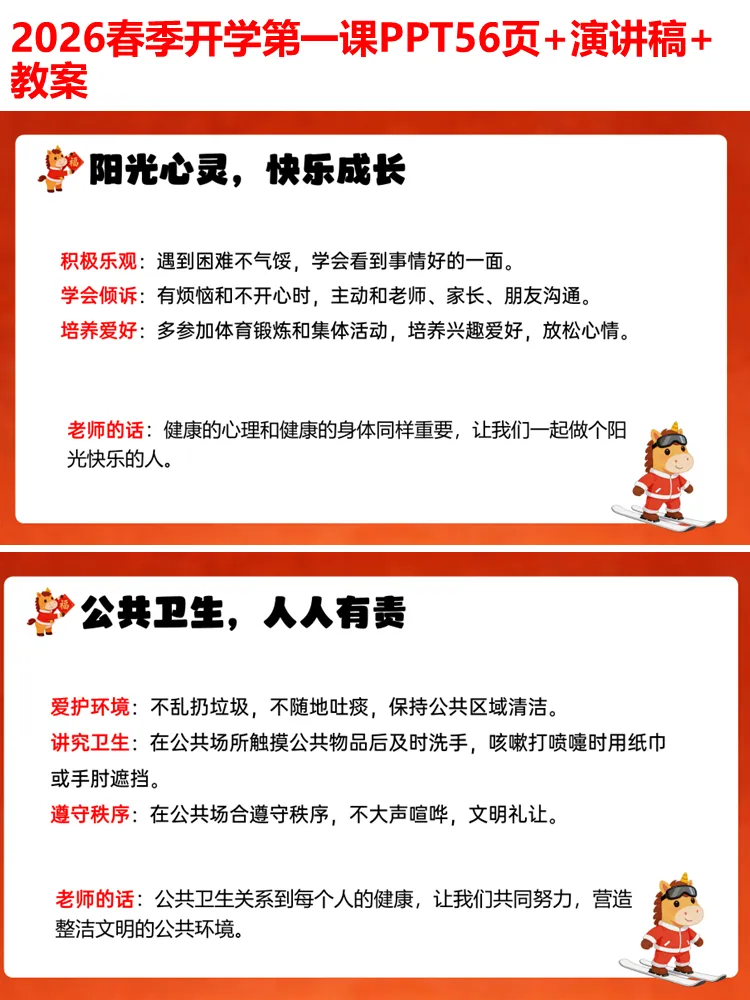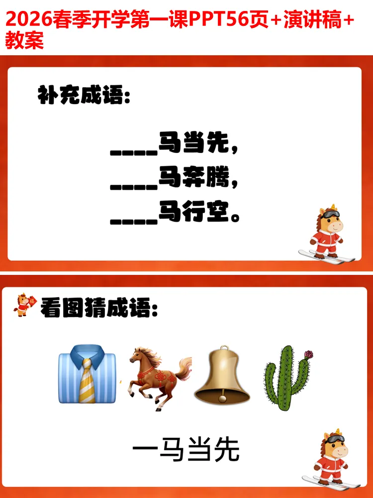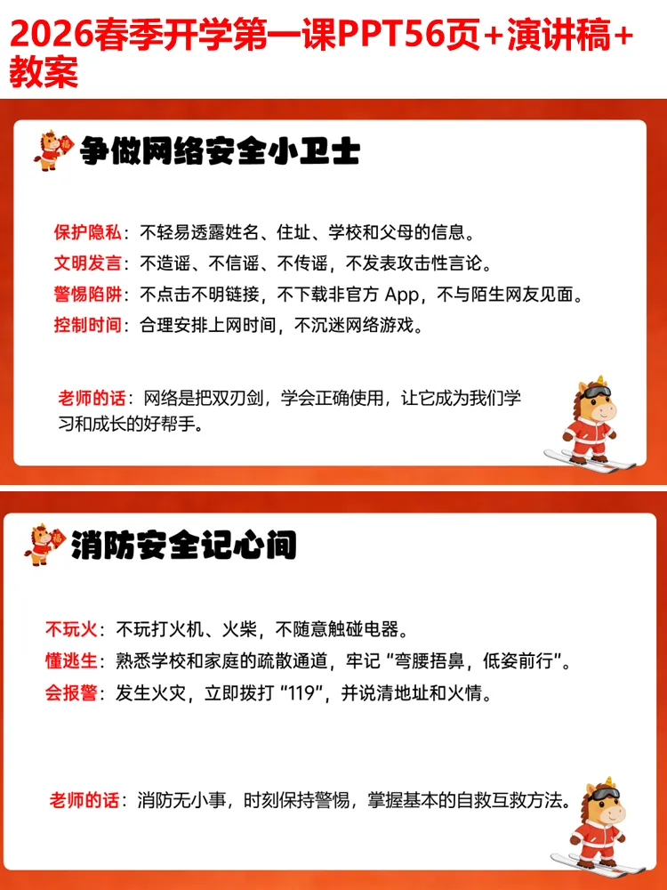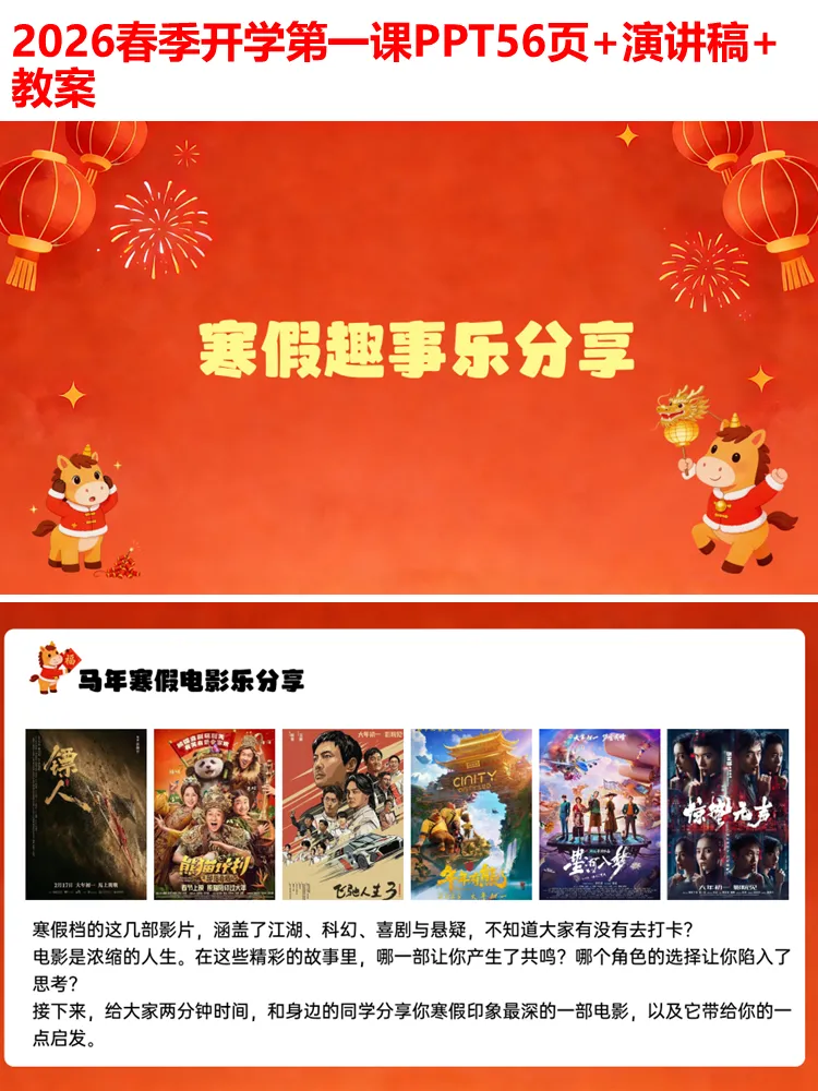 新学期伊始,为让一年级小朋友快速收心归位,融入校园生活,我们打造了以马年为主题的开学第一课 PPT,围绕寒假分享、马年知识、行为规范、安全常识、新学期目标五大板块,用趣味互动、知识科普、习惯培养的形式,为孩子们开启充满新意的校园新旅程,让课堂既有年味又有干货,既有乐趣又有收获。
