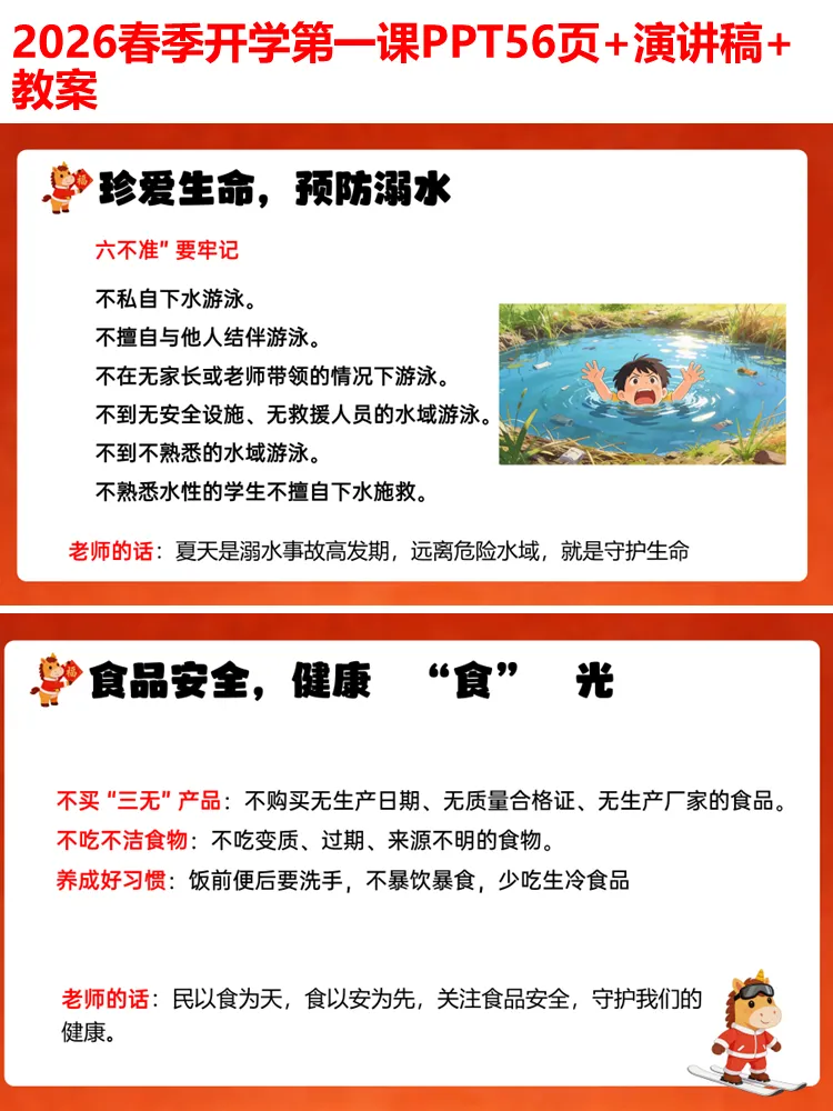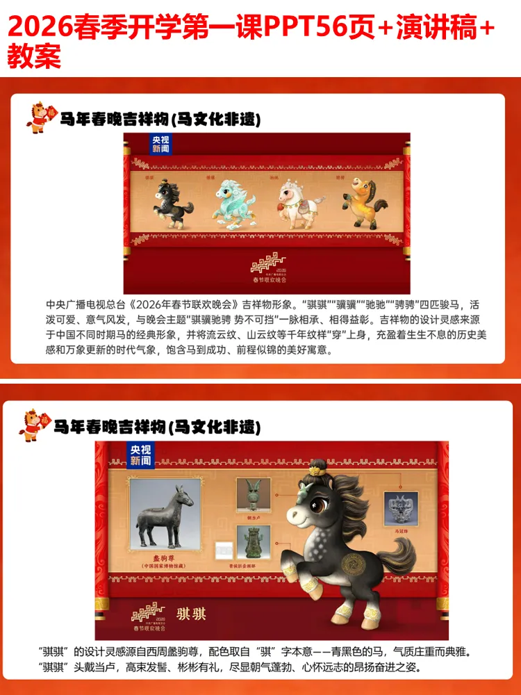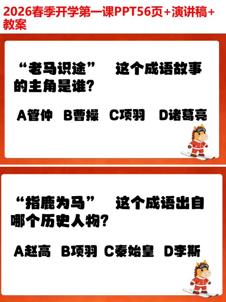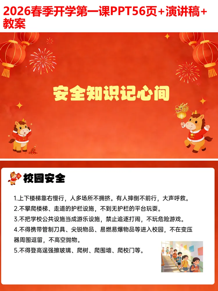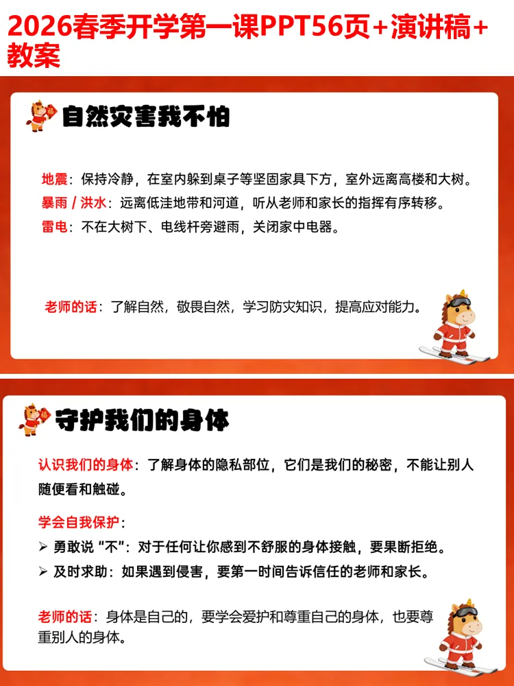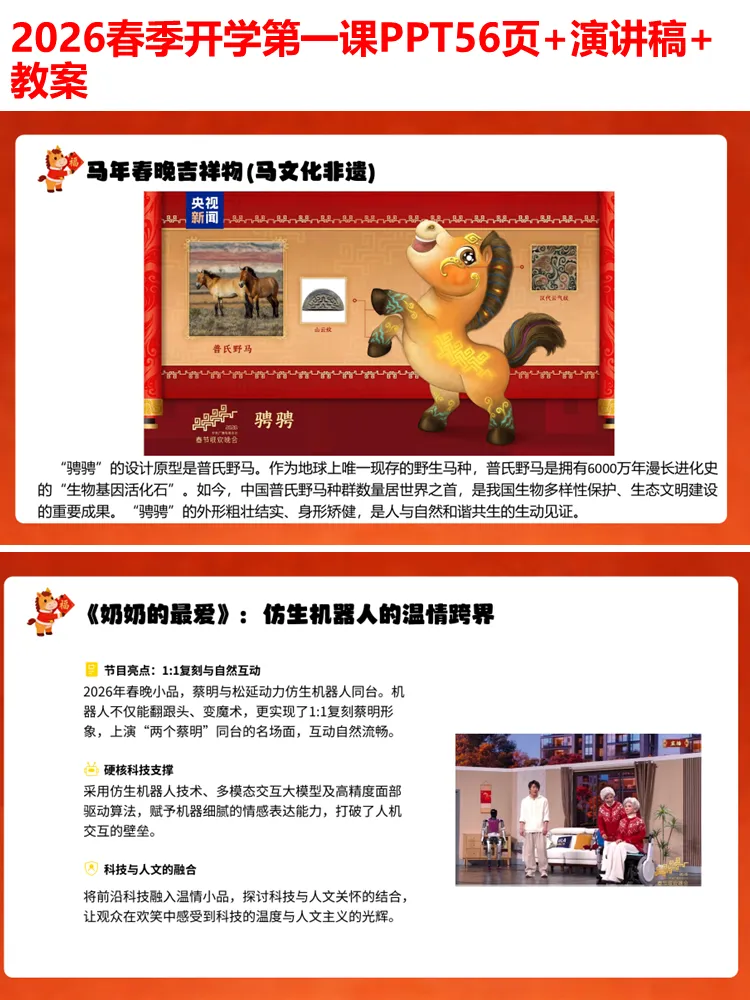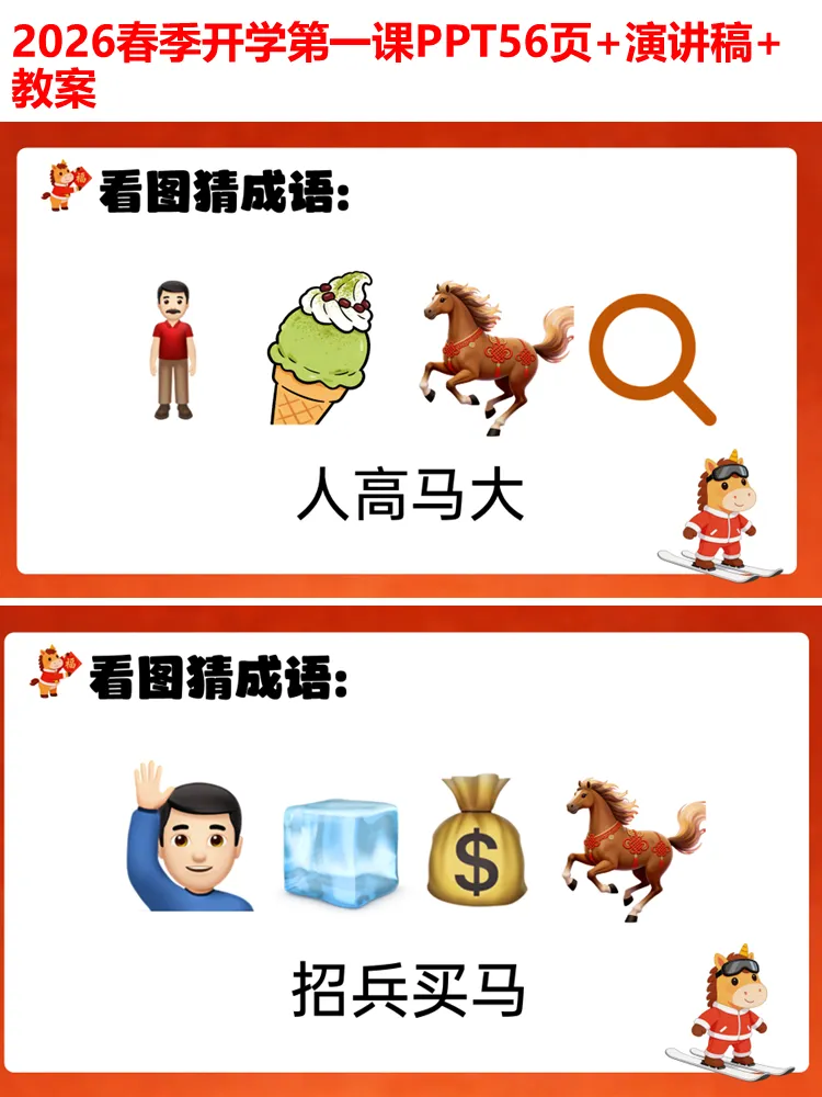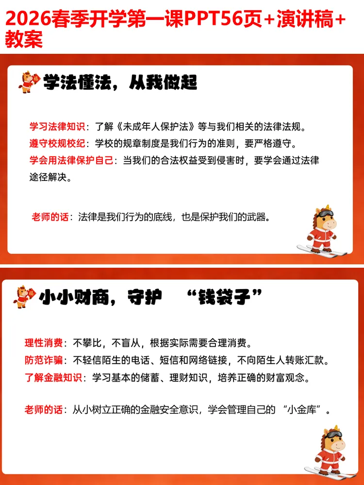 新学期伊始,为让一年级小朋友快速收心归位,融入校园生活,我们打造了以马年为主题的开学第一课 PPT,围绕寒假分享、马年知识、行为规范、安全常识、新学期目标五大板块,用趣味互动、知识科普、习惯培养的形式,为孩子们开启充满新意的校园新旅程,让课堂既有年味又有干货,既有乐趣又有收获。