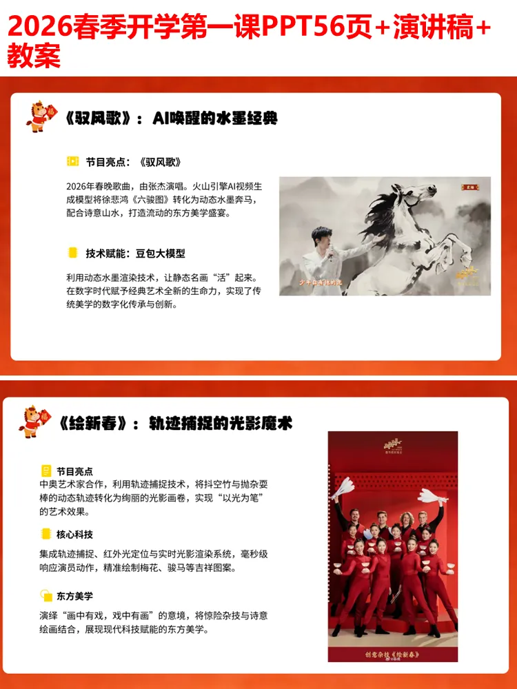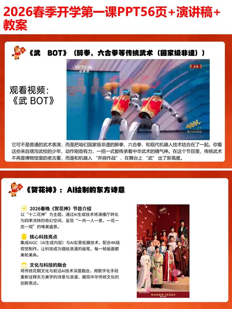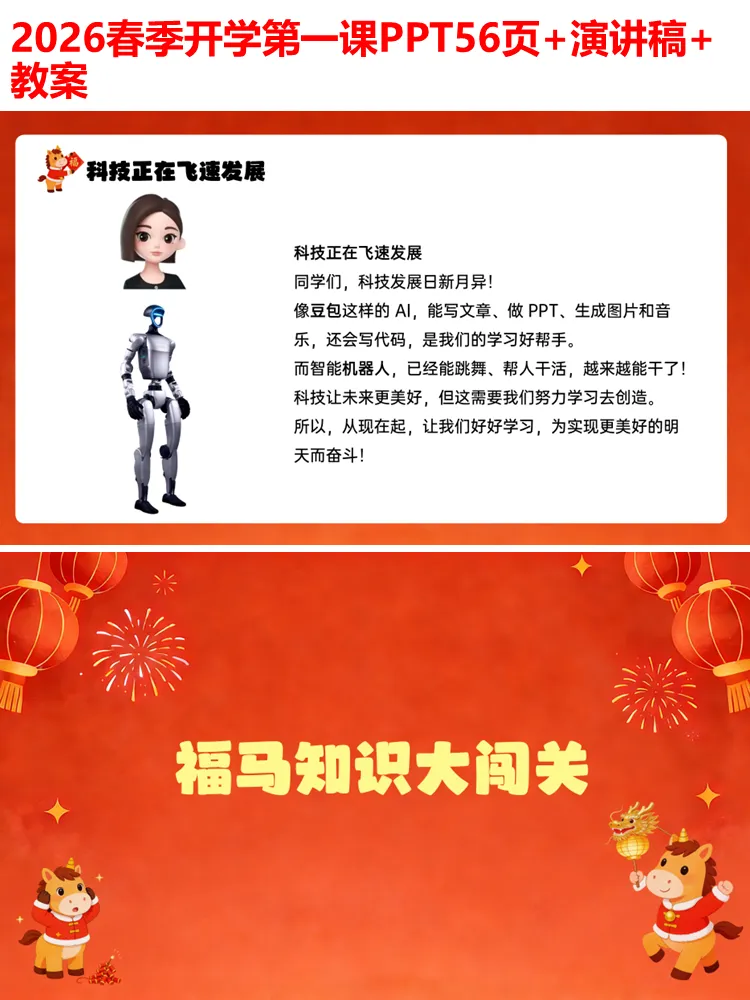 课堂开篇的「寒假趣事乐分享」环节,聚焦寒假档精彩影片,从《飞驰人生 3》到《熊猫计划之部落奇遇记》,涵盖江湖、科幻、喜剧等多种类型,让孩子们分享观影感悟,在交流中体会电影里的人生思考,锻炼表达能力。紧接着的「福马知识大闯关」是课堂的趣味亮点,从 2026 马年春晚吉祥物 “骐骐”“骥骥”“驰驰”“骋骋” 的非遗设计灵感,到春晚《驭风歌》《武 BOT》等科技与文化融合的精彩节目,让孩子们感受马文化的深厚底蕴;还有生肖问答、马的别称、成语闯关、历史典故等趣味题目,在轻松答题中积累知识,感受中华传统文化的魅力,更借着科技赋能传统文化的案例,让孩子们领略科技的神奇,种下探索的种子。
