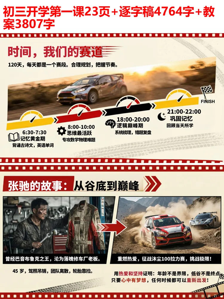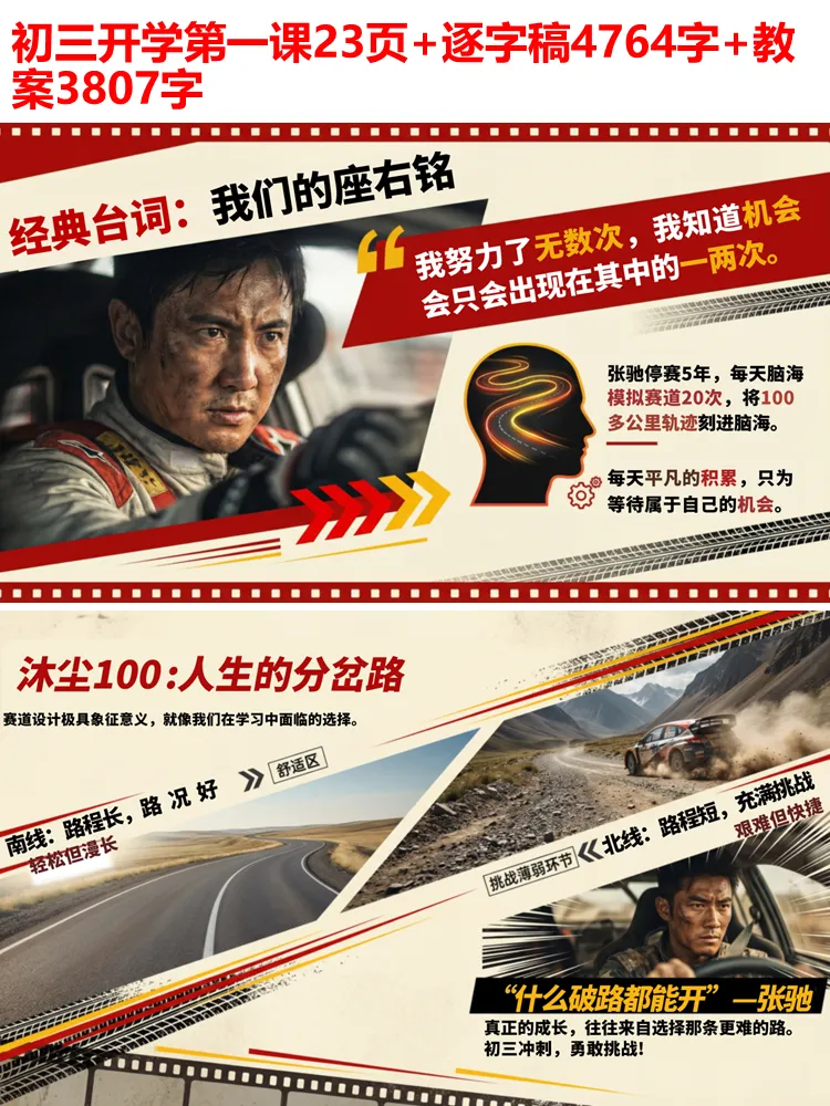 《飞驰人生 3》里的张驰,从巴音布鲁克之王跌落至落魄修车厂老板,45 岁的他驾照吊销、团队离散,却因心中的热爱重燃斗志,征战沐尘 100 拉力赛。他停赛 5 年,每天在脑海模拟赛道 20 次,将 100 多公里轨迹刻进脑海,告诉我们:所有平凡的积累,都是为了等待机会的降临。而沐尘 100 的南北赛道,更是人生的隐喻 —— 南线轻松却漫长,北线艰难但快捷,真正的成长,永远藏在敢于挑战薄弱环节的选择里。初三冲刺,唯有跳出舒适区,直面难题,才能实现真正的突破。