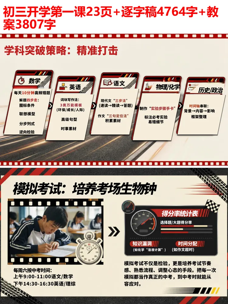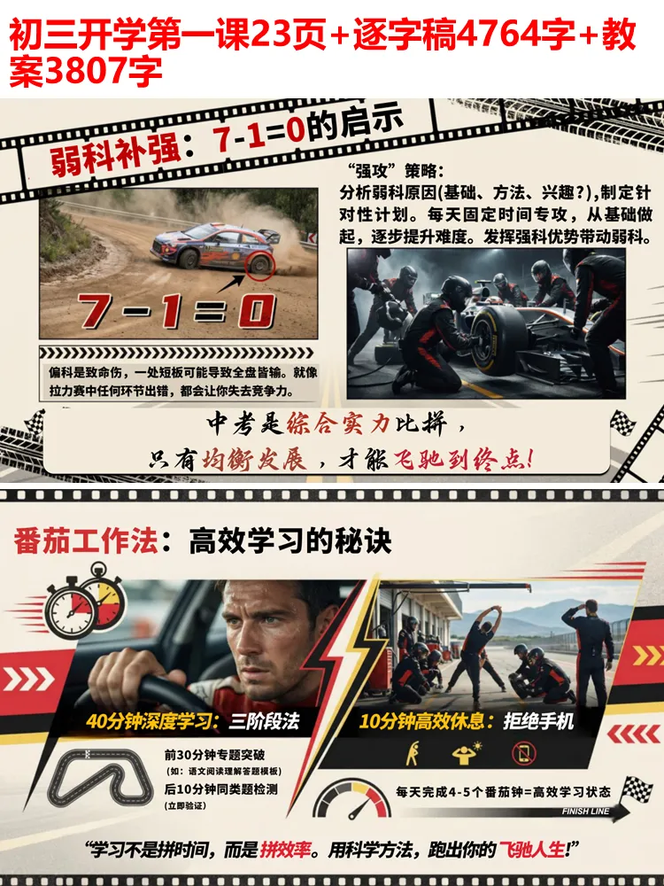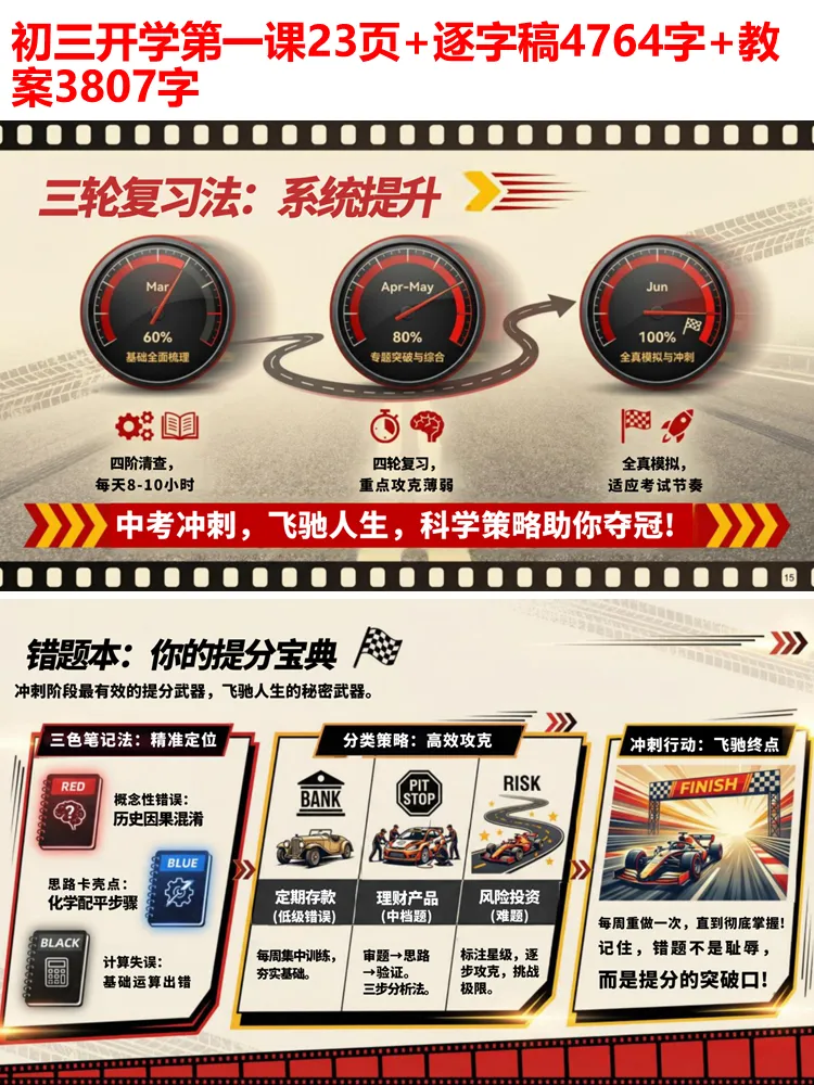 冲刺的路上,光有热血不够,科学的策略才是夺冠的关键。三轮复习法夯实基础、突破专题、全真模拟;错题本作为提分宝典,每周重做、分类攻克,让错误成为进步的阶梯;三色笔记法精准定位问题,番茄工作法提升学习效率;各学科专属突破策略,让每一分努力都能落到实处。我们更要记住,偏科是中考的致命伤,7-1=0 的道理时刻警醒着我们,均衡发展,才能行稳致远。