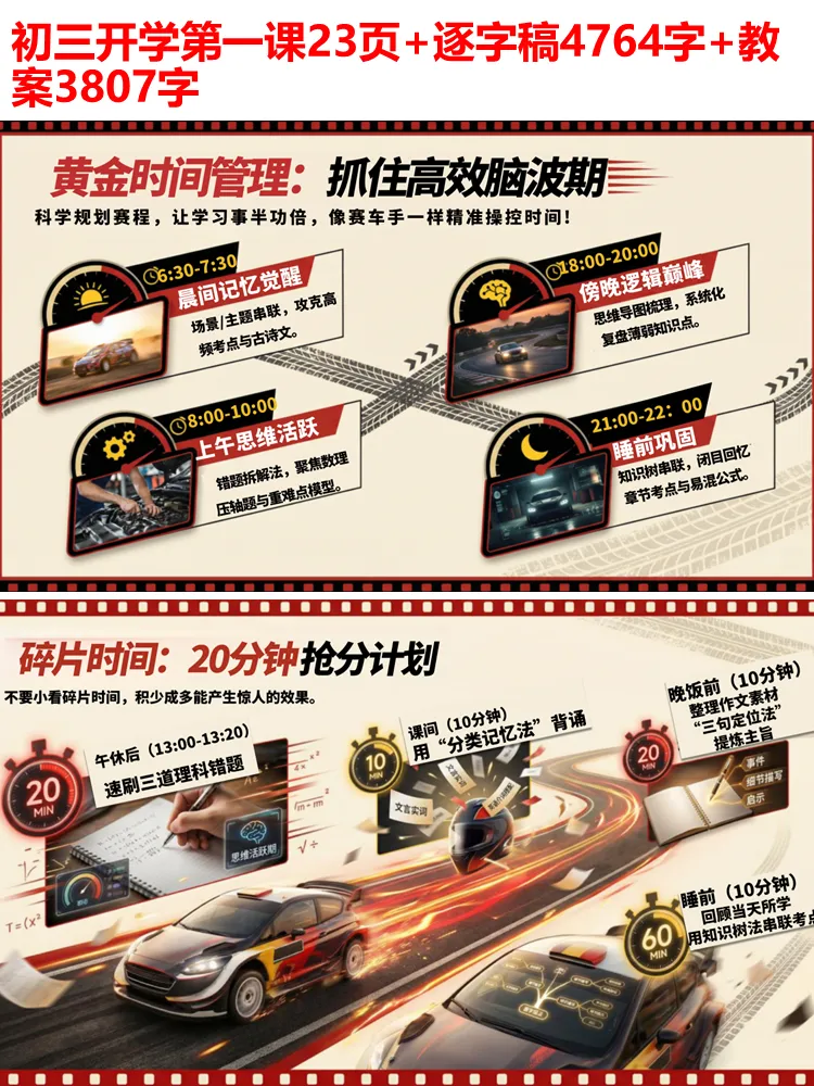 这趟冲刺之旅,仅有 120 天的赛程,每一天都是一个不容懈怠的赛段。就像拉力赛需要精准把控节奏,我们的学习也需踩准高效时间节点:晨间记忆黄金期攻克古诗文与英语单词,上午思维活跃时专攻数理难题,傍晚逻辑巅峰期梳理知识、复盘错题,睡前的巩固时刻串联全天所学。那些被妥善利用的碎片时间,也终将成为提分的关键,积少成多,方能汇聚成冲刺的底气。