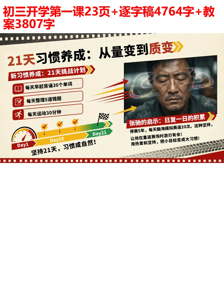 所谓飞驰人生,不过是日复一日的积累,是在困境中有人托底,是永远怀揣热爱重新出发。张驰用 5 年的坚持换来重返赛场的机会,而我们的 21 天习惯养成计划,也将从每天背诵 30 个单词、整理 5 道错题、运动 30 分钟开始,让量变终成质变。