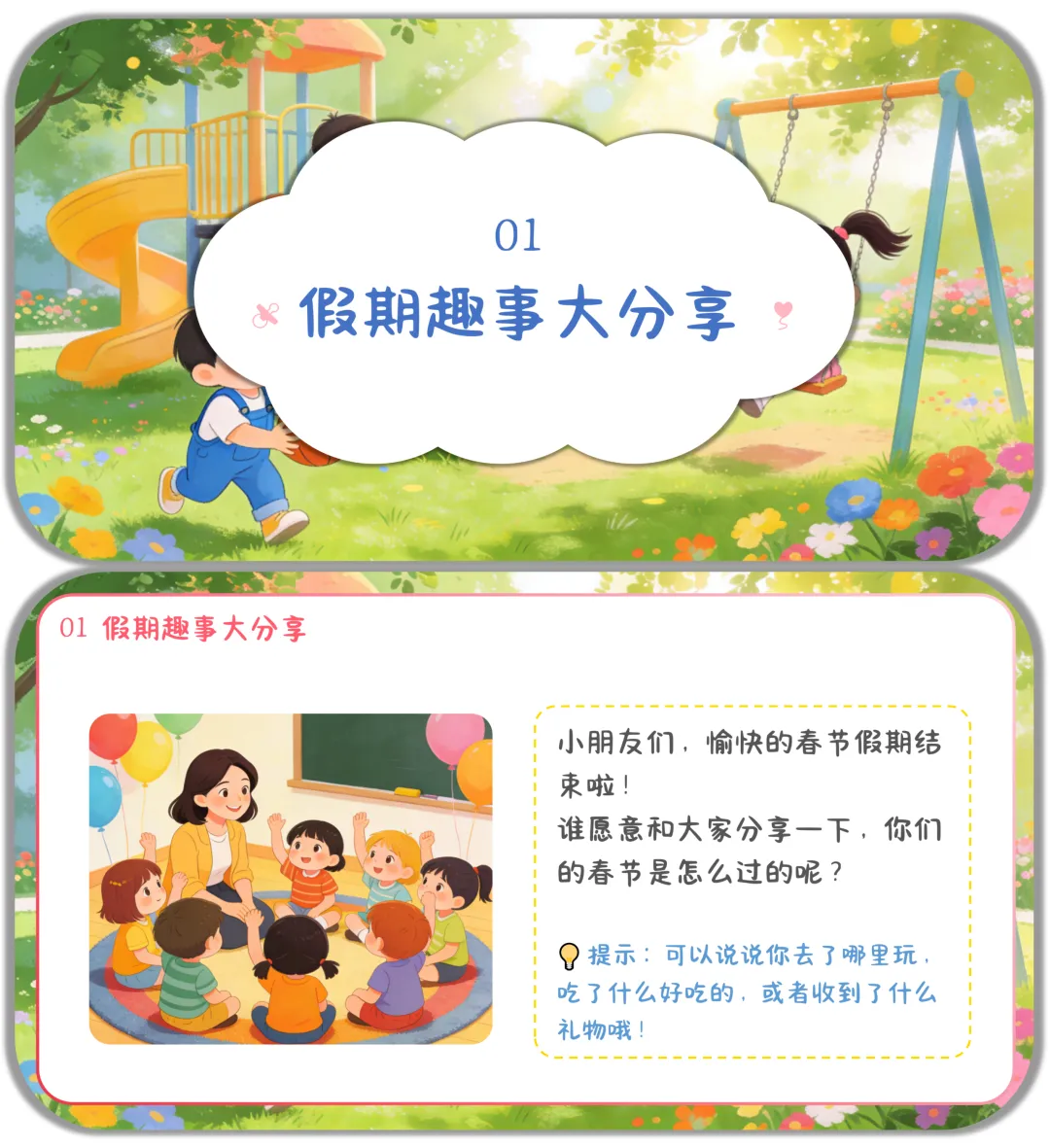 愉快的春节假期结束,幼儿重返幼儿园。本活动通过分享假期趣事、学习生活好习惯、掌握安全知识、体验合作游戏,帮助幼儿快速适应集体生活,建立新学期的积极期待,培养良好的行为习惯与安全意识,为新学期的成长奠定基础。