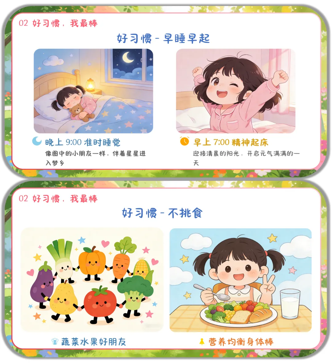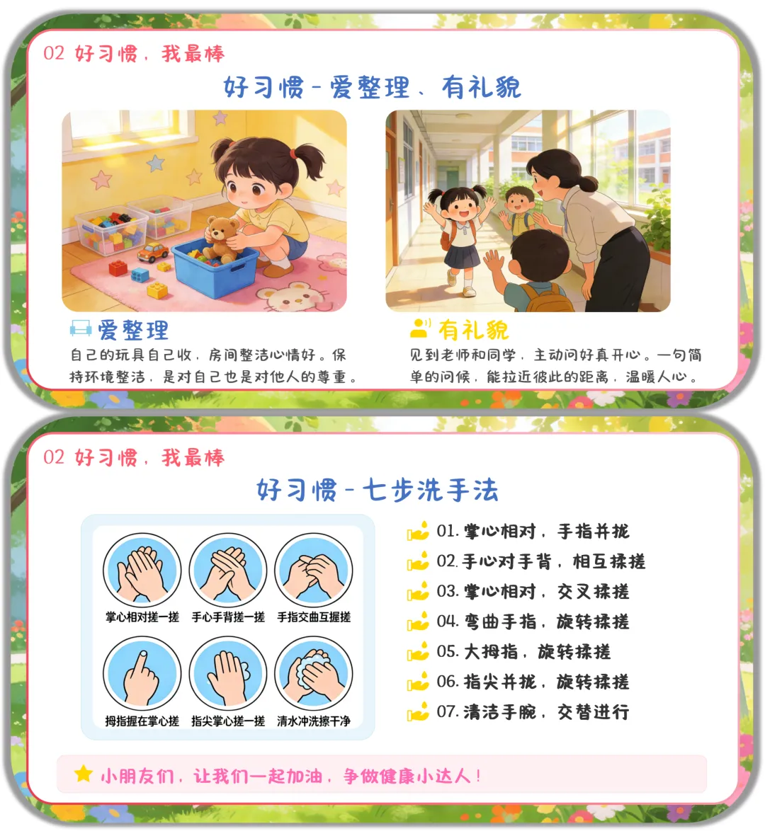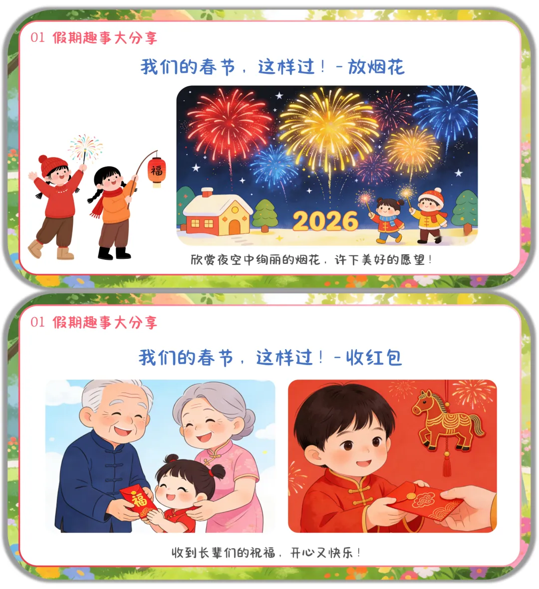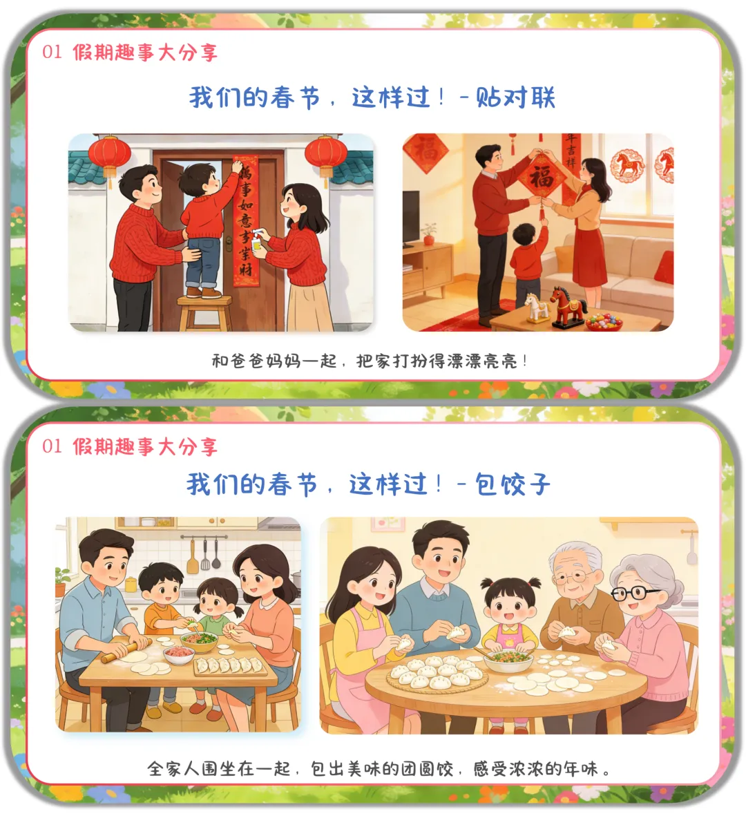 1. 认知目标:乐于分享春节假期的经历,了解贴对联、包饺子、放烟花、收红包等春节传统习俗;知道早睡早起、不挑食、爱整理、七步洗手法等生活好习惯的重要性;掌握居家安全、防拐骗安全、交通安全的基本常识。