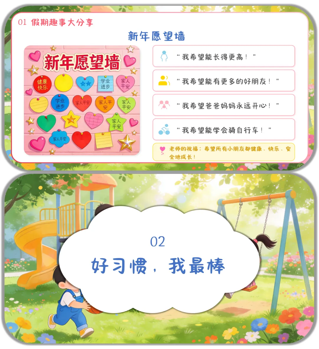2. 能力目标:能大胆表达自己的新年愿望;在游戏中学会安全、礼貌、合作地与同伴互动;能遵守新学期的约定,尝试独立完成力所能及的事情。