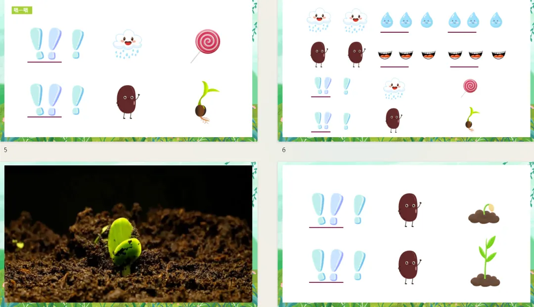 3、(播放种子出土的视频)欣赏歌曲第二段,种子宝宝出土和长大时什么样子的?要用什么样的声音来唱呢?