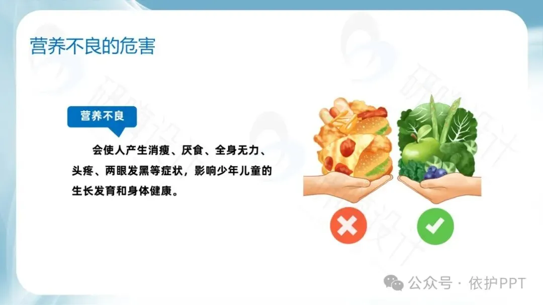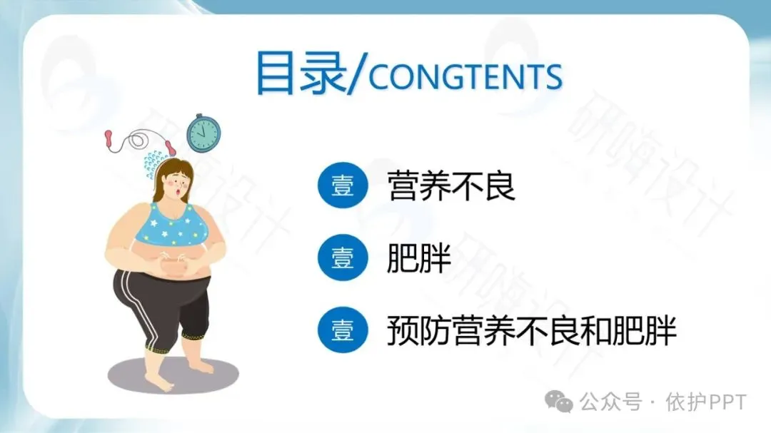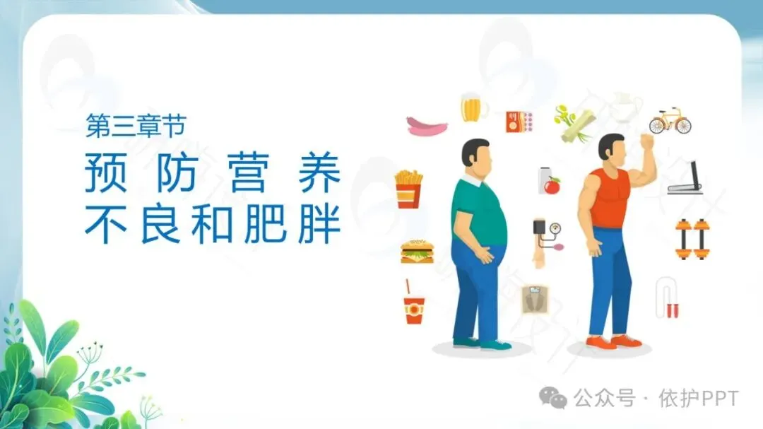 随着现代社会生活节奏的加快,人们的饮食习惯和生活方式发生了深刻的变化。这种变化在带来便利的同时,也带来了一系列健康问题。营养不良与肥胖,作为当前社会普遍关注的健康问题,已经对人们的身心健康产生了不可忽视的影响。今天带来的是关于营养不良与肥胖健康宣教的PPT,希望可以从今天的内容中了解到如何更好的健康生活。