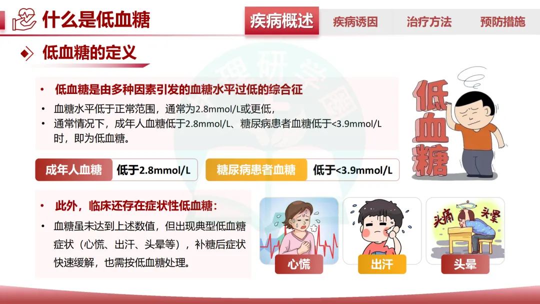 定义:低血糖是由多种因素引发的血糖水平过低的综合征。成年人血糖 <2.8 mmol/L,糖尿病患者血糖 <3.9 mmol/L,症状性低血糖血糖未达上述数值,但出现典型症状(心慌、出汗、头晕等),补糖🍬后缓解,也需按低血糖处理。