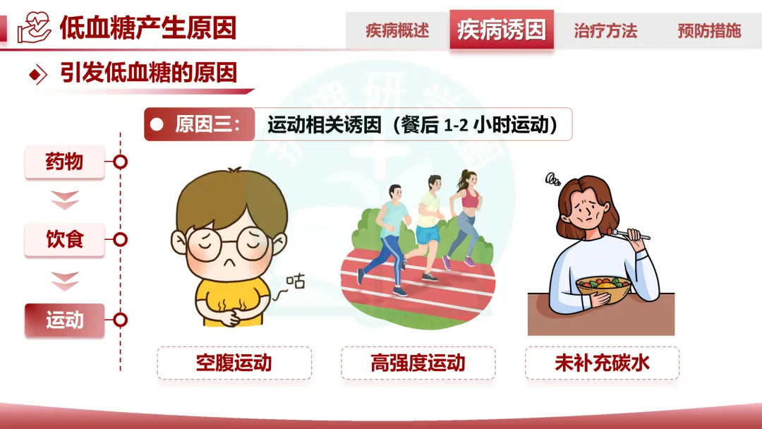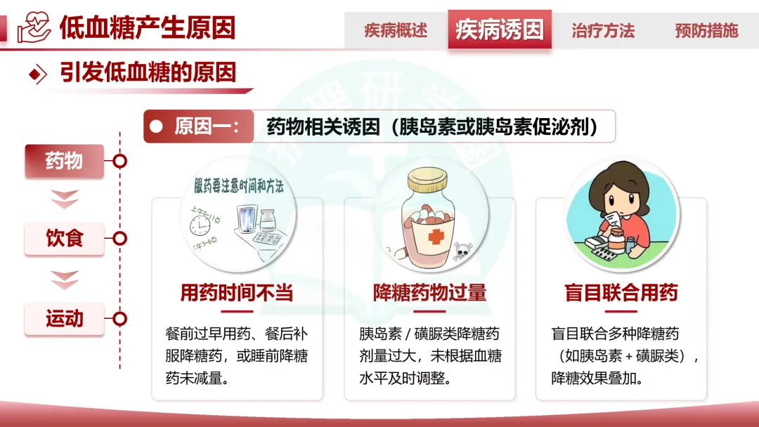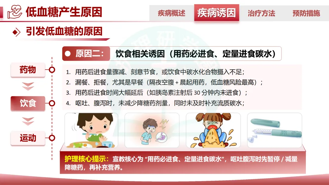 饮食相关:用药💊后进食量骤减或漏餐(尤其早餐),碳水化合物摄入不足,用药后进食时间延后(如胰岛素注射后30分钟内未进食),呕吐/腹泻时未调整降糖药剂量,未补充碳水化合物