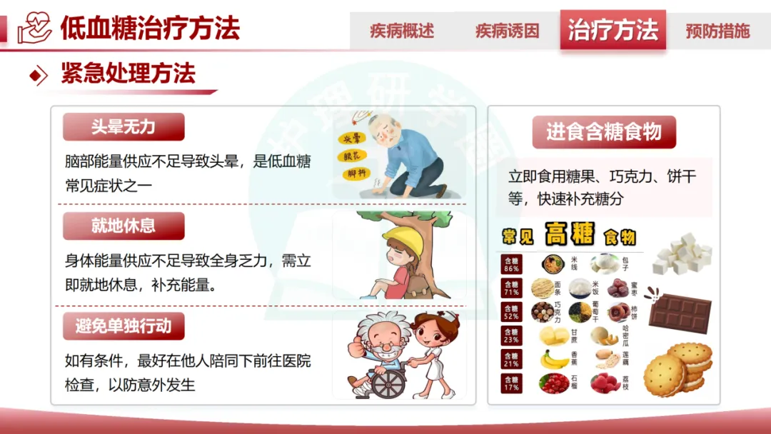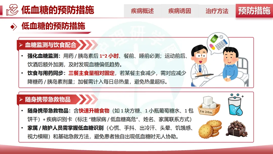 随身携带急救物品:快速升糖食物(方糖、葡萄糖水、饼干等)疾病识别卡标注“糖尿病/低血糖高危”、姓名、家属联系方式