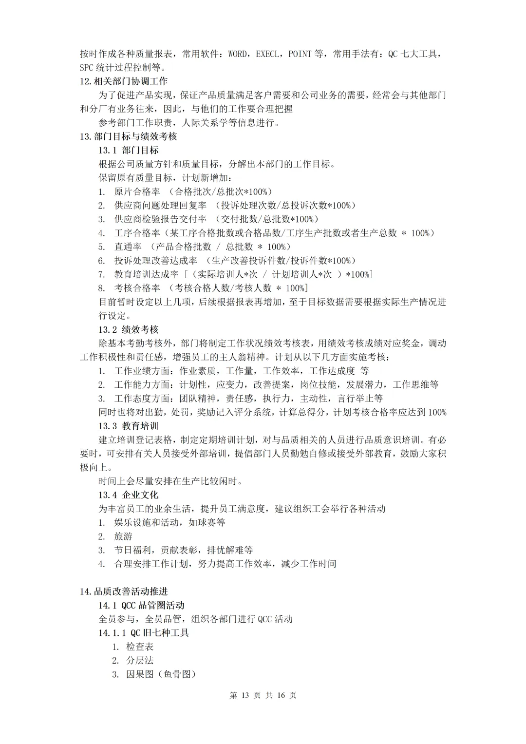 为贯彻公司“质量第一、服务优质、持续改进、顾客满意”的质量方针,确保产品质量稳定提升,满足客户需求,增强客户满意度,特制定本年度质量工作计划。通过明确目标、细化任务、落实责任,推动公司质量管理水平再上新台阶。