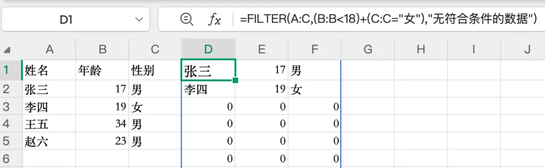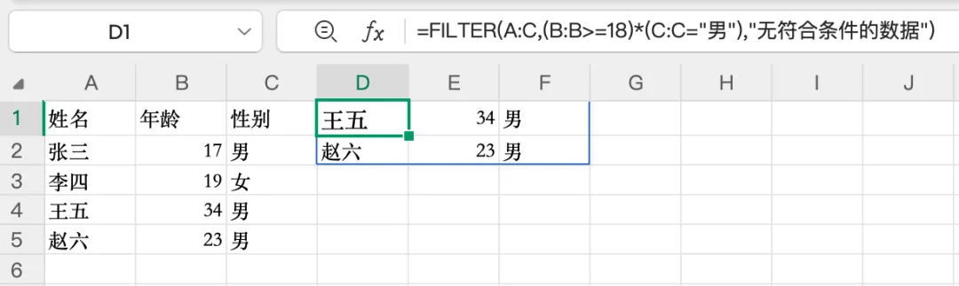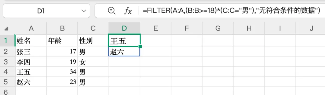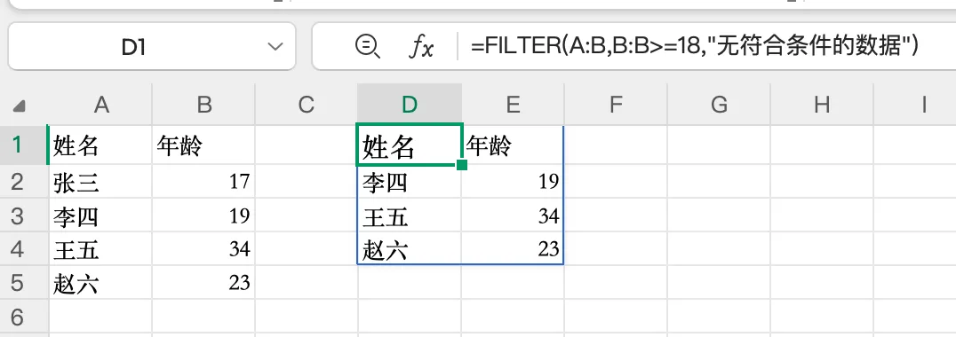 第一个参数 A:B是要返回的完整数据区域,第二个参数 B:B>=18是筛选条件。就这么简单,结果自动溢出到下方单元格,无需手动下拉填充。