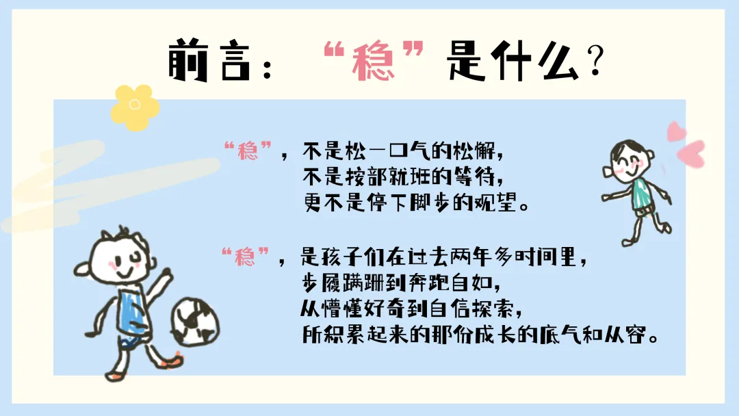 “稳”,不是松一口气的松懈,不是按部就班的等待,更不是停下脚步的观望。“稳”,是孩子们在过去两年多时间里,从步履蹒跚到奔跑自如,从懵懂好奇到自信探索,所积累起来的那份成长的底气和从容。