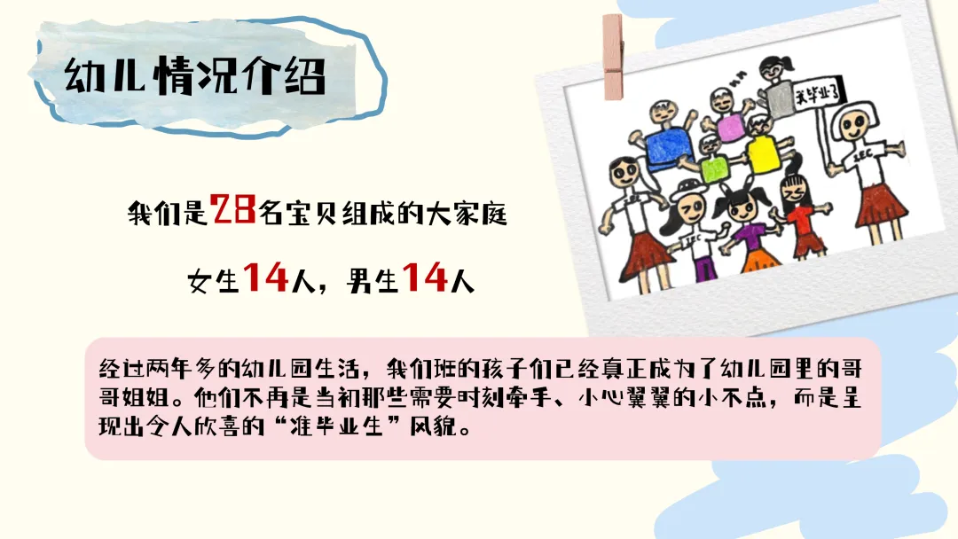 我们班级是一个由28 名宝贝组成的温暖大家庭,其中女生 14 人,男生 14 人,性别比例均衡。经过两年多的幼儿园生活,孩子们已经彻底褪去了刚入园时的稚嫩,真正成为了幼儿园里的哥哥姐姐,展现出了令人欣喜的 “准毕业生” 风貌。他们不再是当初需要时刻牵手、小心翼翼的小不点,在自主能力、交往能力和学习能力等方面都有了显著的进步。