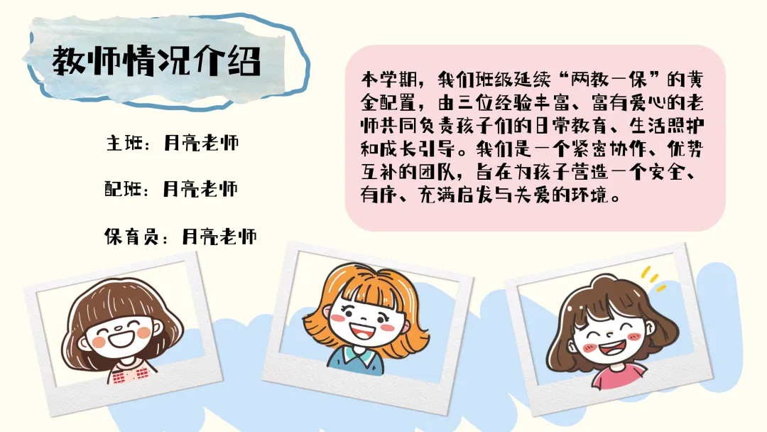 本学期,我们班级依然延续“两教一保” 的黄金配置,由我和另外两位经验丰富、富有爱心的月亮老师(配班老师、保育员)共同负责孩子们的日常教育、生活照护和成长引导。我们三位老师分工明确、紧密协作、优势互补,始终致力于为孩子们营造一个安全、有序、充满启发与关爱的成长环境,关注每一个孩子的个性发展和需求。
