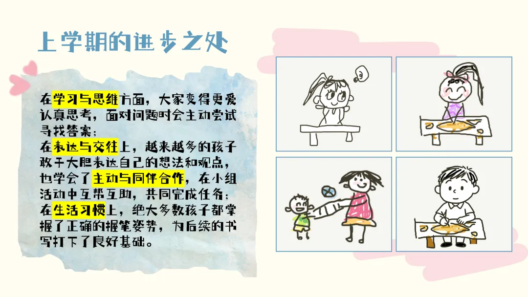 在上学期的学习和生活中,孩子们的成长有目共睹。在学习与思维方面,大家变得更爱认真思考,面对问题时不再被动等待答案,而是会主动尝试寻找解决办法;在表达与交往上,越来越多的孩子敢于在集体面前大胆表达自己的想法和观点,也学会了主动与同伴合作,在小组活动中互帮互助,共同完成任务;在生活习惯上,绝大多数孩子都掌握了正确的握笔姿势,为后续的书写学习打下了良好基础,同时在自主进餐、整理个人物品等方面也有了明显进步。