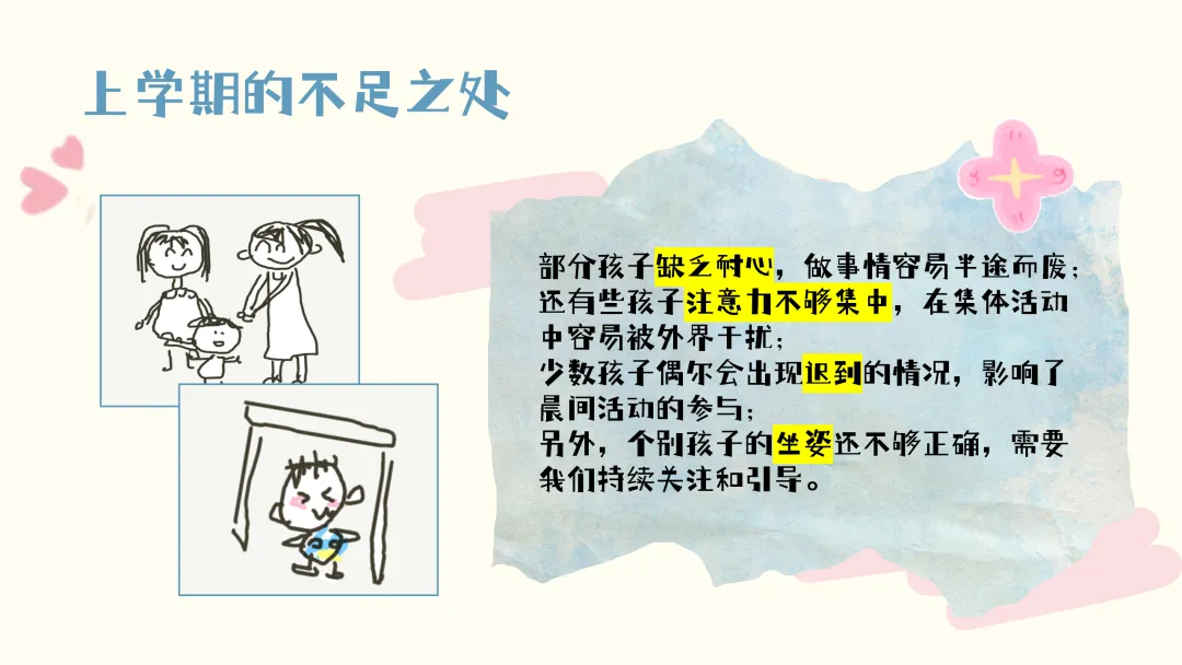 当然,孩子们也存在一些需要持续改进的地方。部分孩子缺乏耐心,做事情容易半途而废,遇到一点困难就想放弃;还有些孩子注意力不够集中,在集体活动中容易被外界干扰,影响学习效果;少数孩子偶尔会出现迟到的情况,不仅错过了宝贵的晨间活动,也影响了班级整体教学节奏;另外,个别孩子的坐姿还不够正确,长期下来可能影响身体健康和书写习惯,需要我们老师和家长共同关注并及时引导。
