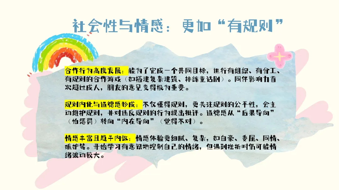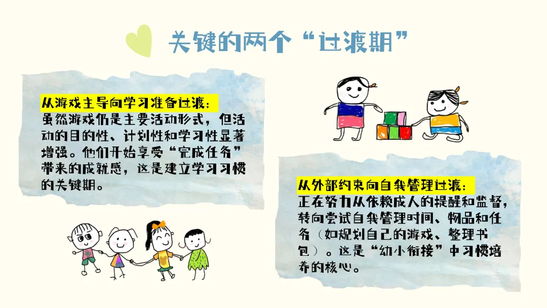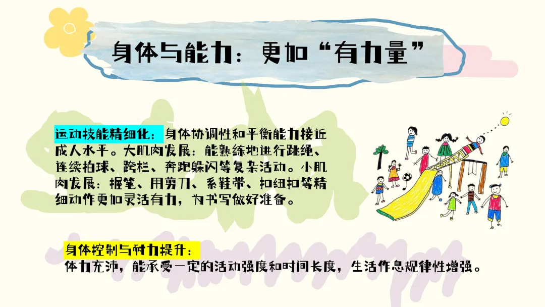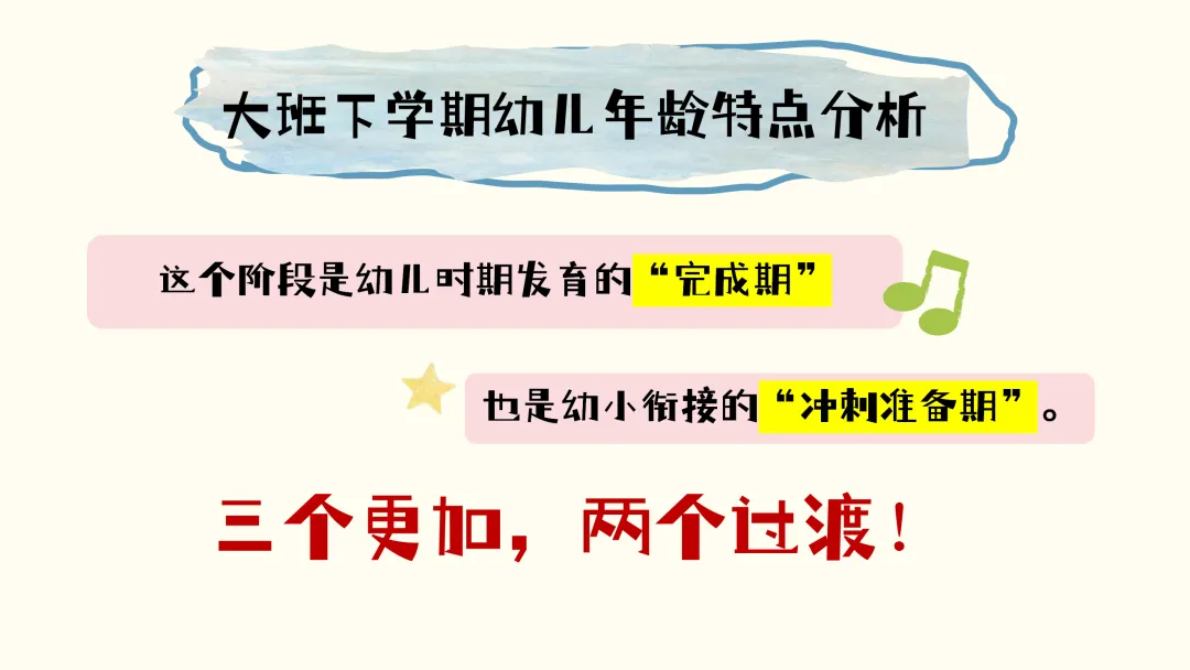 大班下学期是幼儿时期发育的“完成期”,也是幼小衔接的 “冲刺准备期”,这个阶段的孩子呈现出 “三个更加,两个过渡” 的鲜明特点。