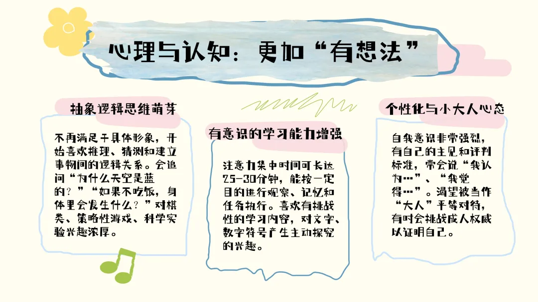 心理与认知:更加“有想法”。孩子们不再满足于具体形象的事物,开始喜欢推理、猜测和建立事物间的逻辑关系,经常会追问 “为什么天空是蓝的?”“如果不吃饭,身体里会发生什么?” 这类问题,对棋类、策略性游戏、科学实验等充满兴趣。他们的注意力集中时间可长达 25-30 分钟,能按一定目的进行观察、记忆和任务执行,对文字、数字符号也产生了主动探究的兴趣。同时,自我意识非常强烈,有自己的主见和评判标准,常会说 “我认为…”“我觉得…”,渴望被当作 “大人” 平等对待,有时会挑战成人权威以证明自己。