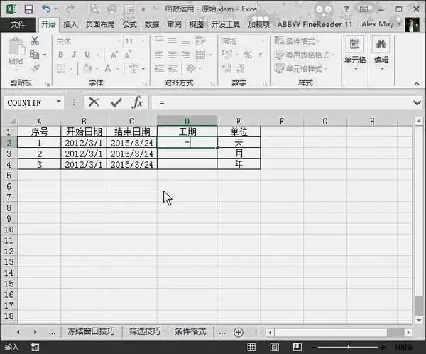笔者先简单解释下以下表格中的单元格D2输入的公式“=DATEDIF(B2,C2,"d")“前两个参数分别是开始日期和结束日期,第三个参数"d"是计算天数的参数,也可以改成"m"(计算月份)和"y"(计算年份)。