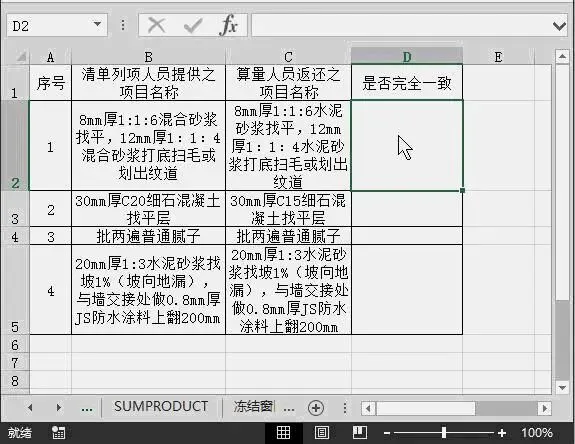 3.Exact函数在快速查找修改前后表格的内容差异在平时的造价工作中,大家一定会碰到这样一个问题,在您已经编制了工程量清单的格式(包括清单描述、单位等),需要其他算量同事填写工程量。但他们完成填写工程量的表格是否会调整或不小心修改过原表格内容(如清单描述或单位等),你要是以一一核对或复核一下,那简直太费时间了。其实Exact函数火眼金睛,很快识别出其中的差异。比如下表中的第2、3行的B、C列的内容已有差异了,请看动态演示: