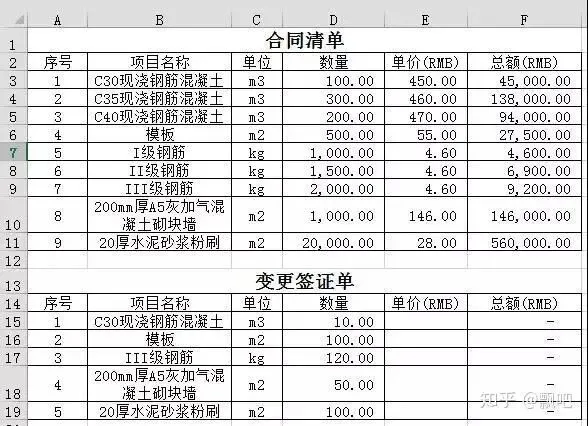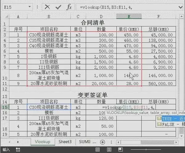 例如:施工单位在进行投标报价时,有很多单体工程分不同的清单表格进行报价,而其实大部分的清单项目是相同的,在完成第一个单体工程的投标报价后,再运用此函数在其他单体清单中,可达到了事半功倍。又如某个变更签证要参照工程合同(工程量清单为计价合同)的相应清单项目进行套价: