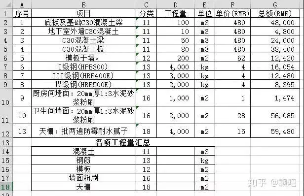 5.Sumif函数简单乖巧完成工程量指标汇总大家在统计工程量的各项技术指标时,往往先需要汇总各项工程量(如混凝土的总和),该项工作特别麻烦,还容易出错,有什么方法可以一步到位呢?常用函数Sumif可以帮大家解决这个问题。案例如下: