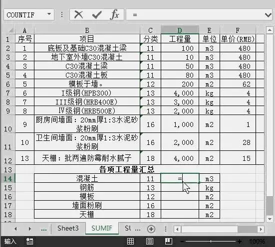 请注意,需要将各项工程量进行分类(如11、12……)。笔者再解释下单元格D14的公式“=SUMIF($C$2:$C$12,C14,$D$2:$D$12)”:第一个参数“$C$2:$C$12”和第三个参数”$D$2:$D$12“必须保持单元格行数对应。比如本案例中"分类"列的起始行数为2,"工程量"列的起始行数也必须为2。同样,"分类"列的结束行数为12,"工程量"列的结束行数也必须为12。另外,这两个参数必须用”$”锁定单元格,这么做是为了方便后期批量复制单元格的时候分类汇总数据不会随粘贴单元格位置的不同而变化。