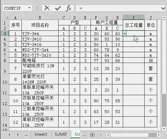 解释一下上面的公式“=SUMPRODUCT(C3:E3,F3:H3)”,大家可以理解为两个数组(户型组和每户工程量组)的乘积求和公式。