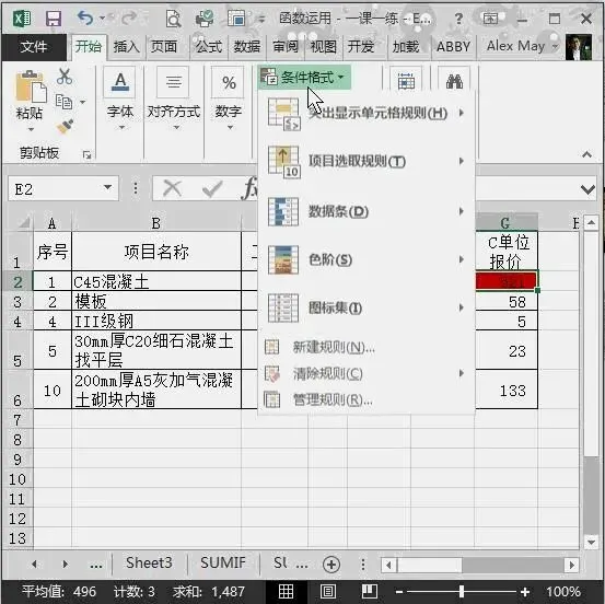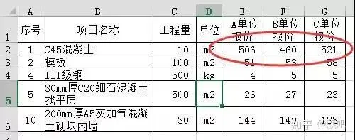 7.条件格式快速标注各项报价最高(低)价对于业主或造价咨询人员在对投标文件进行回标分析的时候一定是时间紧、任务重,如何才能快速地将各家单位投标单价中的最高价和最低价以不同颜色突出显示,以方便下一步去判断各投标单位的投标报价高低。条件格式就可以帮我们这个忙。下面请看案例: